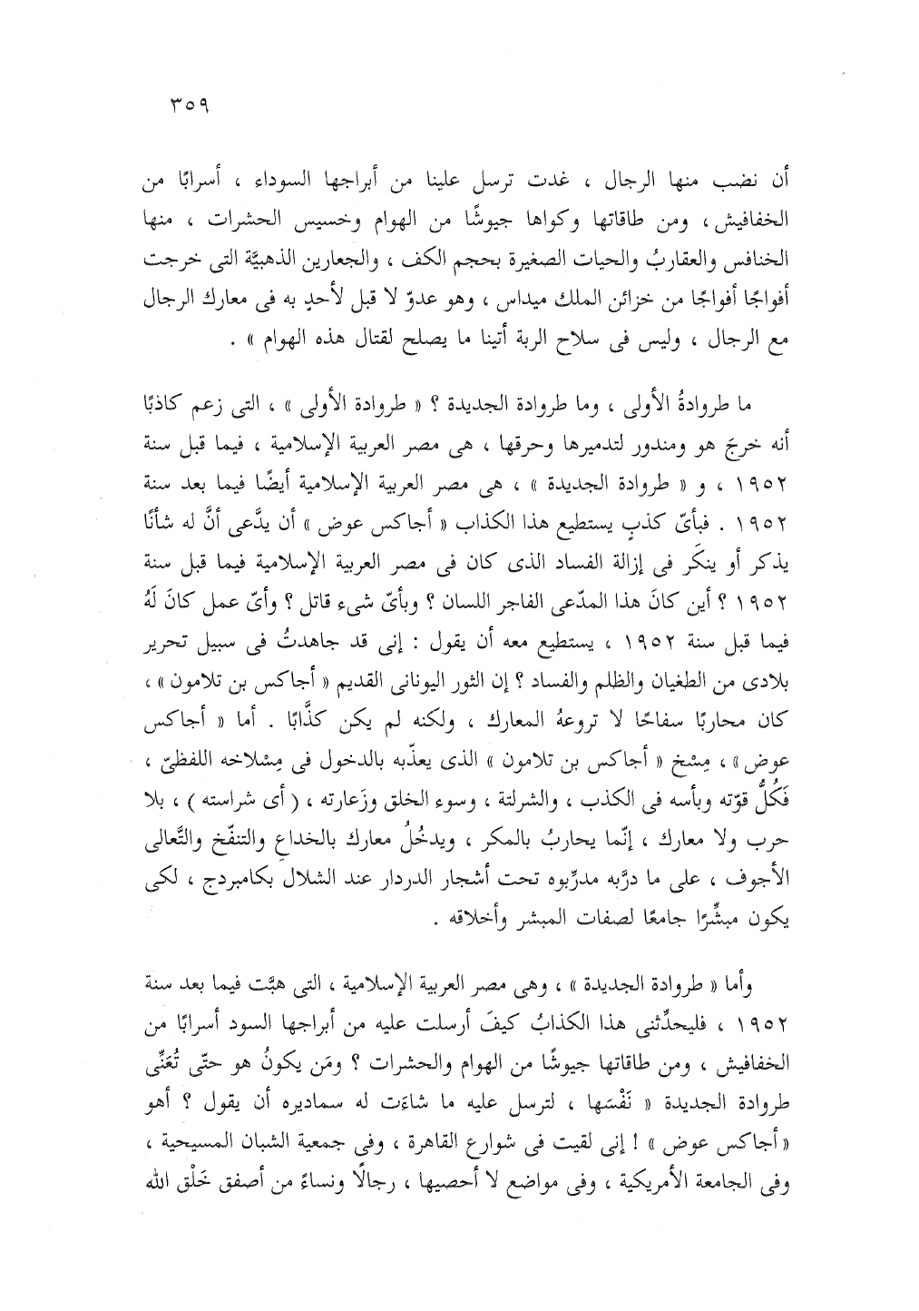 واما طراودة الجديدة وهى مصر العربية الإسلامية التي هبت فيما بعد سنة 1952 فليحدثنى هذا الكذاب كيف ارسلت عليه من ابراجها السود ايرابا من الخفافيش ومن طاقاتها جيوشا من الهوام والحشرات ومن يكون هو حتى تعنى طرواده الجديدة نفسها لترسل عليه ما شاءت له سماديره ان يقول اهو أجاكس عوض انى لقيت في شوارع القاهرة وفي جمعيه الشبان المسيحية وفي الجامعة الأمريكية وفي مواضع لا احصيها، رجالا ونساء من أصفق خلق الله