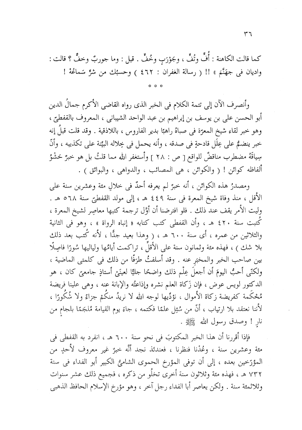 ومصدر هذه الكوائن أنه خبر لم يعرفه أحد في خلال مئة وعشرين سنة على الأقل منذ وفاة شيخ المعرة في سنة 449 هـ إلى مولد القفطى سنة 568 هـ وليت الأمر يقف عند ذلك فلو افترضنا أن أول ترجمة كتبها معاصر لشيخ المعرة كتبت سنة 420 هـ وأن القفطى كتب كتابه انباه الرواة وهو في الثانية والثلاثين من عمره أي سنة 600 هـ وهذا بعيد جدا لأنه كتب بعد ذلك بلا شك فهذه مئه وثمانون سنة على الأقل تراكمت أيامها ولياليها سورا فاصلا بين صاحب الخبر والمخبر عنه وقد أسلفت طرفا من ذلك في كلمتى الماضية ولكنى أحب اليوم أن أجمل علم ذلك واضحا جليا لعينى أستاذ جامعى كان هو الدكتور لويس عوض فان زكاة العلم نشره واذاعته والابانة عنه وهى علينا فريضة محكمة كفريضة زكاة الأموال مؤديها لوجه الله لا نريد منكم جزاء ولا شكورا لأننا نعتقد بلا ارتياب ان من سئل علما فكتمه جاء يوم القيامة ملجما بلجام من نار وصدق رسول الله صلى الله عليه وسلم.