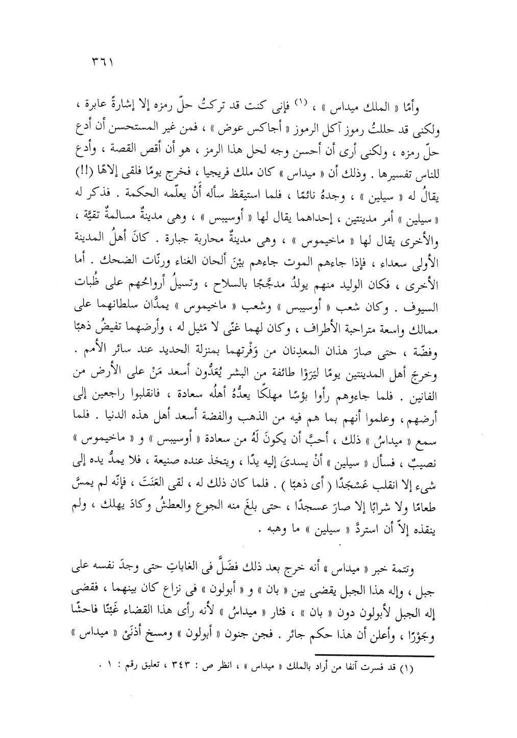 وأما "الملك ميداس"، (1) فانى كنت قد تركت حل رمزه الا اشارة عابرة ولكنى قد حللتُ رموز آكل الرموز أجاكس عوض فمن غير المستحسن ان أدع للناس تفسيرها وذلك ان ميداس كان ملك فريجيا فخرج يوما فلقى إلاها (!!) يقال له "سيلين"، وجده نائما فلما استيقظ سأله ان يعلمه الحكمة فذكر له سيلين أمر مدينتين احداهما يقال لها أوسيبس وهى مدينة مسالمة تقية والأخرى يقال لها ماخيموس وهى مدينة محاربة جبارة كان أهل المدينة الأولى سعداء فاذا جاءهم الموت جاءهم بين ألحان الغناء ورنات الضحك أما الأخرى فكان الوليد منهم يولد مدججا بالسلاح وتسيل أرواحهم على ظبات السيوف وكان شعب أوسيبس وشعب ماخيوس يمدان سلطاتهما على ممالك واسعة متراحبة الاطراف وكان لهما غنى لا مثيل له وارضهما تفيض ذهبا وفضة حتى صار هذان المعدنان من وفرتهما بمنزلة الحديد عند سائر الأمم وخرج أهل المدينتين يوما ليرؤا طائفة من البشر يعدون أسعد من على الأرض من الفانين فلما جاءهم رأوا بؤسا مهلكا يعده أهلة سعادة فانقلبوا راجعين إلى ارضهم وعلموا انهم بما هم فيه من الذهب والفضة أسعد أهل هذه الدنيا فلما سمع ميداس ذلك أحب أن يكون له سعادة أوسيبس وماخيموس نصيب فسأل سيلين أن يسدى اليه يدا ويتخذ عنده صنعية فلا يمد يده إلى شئ الا انقلب عشجدا اى ذهبا فلما كان ذلك له لقى العنت فانه لم يمس طعاما ولا شرابا الا صار عسجدا حتى بلغ من الجوع والعطش وكاد يهلك ولم ينقذه الا ان استرد سيلين ما وهبه.