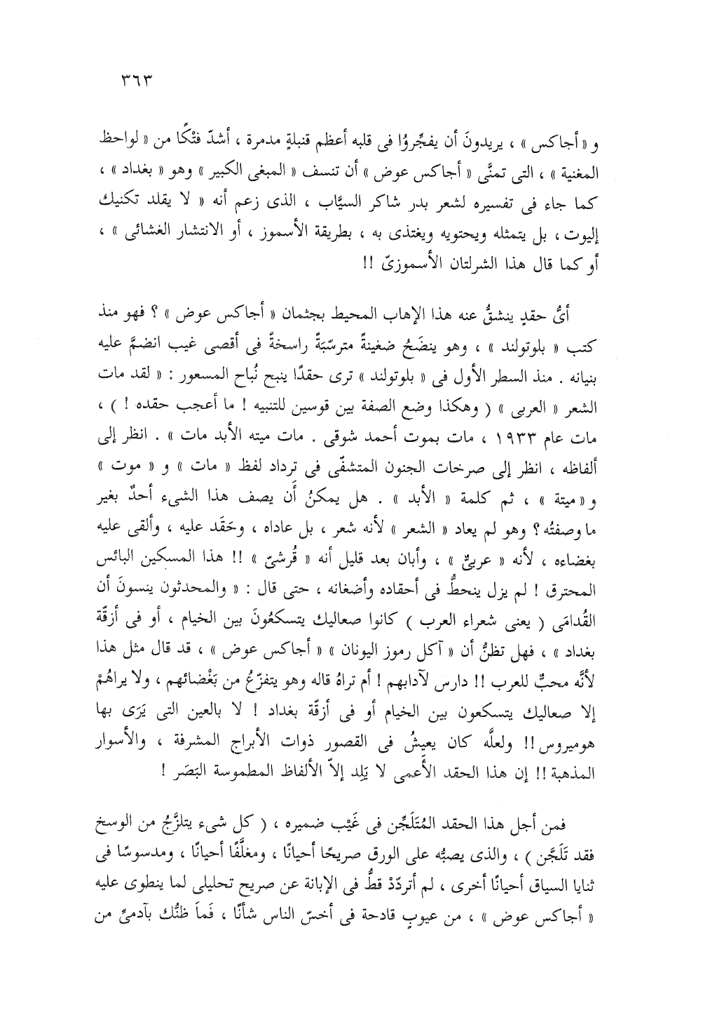 أىُّ حقد ينشق عنه هذا الاهاب المحيط بجثمان أجاكس عوض فهو منذ كتب "بلوتولند" وهو ينضح ضغينه مترسبة راسخة في اقصى غيب انضم عليه بنيابه منذ السطر الأول في "بلوتولند" ترى حقدا ينبح نباح المسعور لقد مات الشعر العربى وهكذا وضع الصفة بين قوسين للتنبيه ما اعجب حقده مات عام 1933 مات بموت أحمد شوقى مات ميته الابد مات انظر إلى الفاظة انظر إلى صرخات الجنون المتشقى في ترداد لفظ مات وموت وميتة ثم كلمة الابد هل يمكن ان يصف هذا الشئ احد يغير ما وصفته وهو لم يعاد الشعر لأنه شعر بل عاداة وحقد عليه والقى عليه بغضاءة لأنه عربى وابان بعد قليل انة قرشى هذا المسكين البائس المحترق لم يزل ينحط في احقاده واضغانه حتى قال والمتحدثون ينسون ان القدامى يعنى شعراء العرب كانوا صعاليك يتسكعون بين الخيام أو في ازفة بغداد فهل تظن ان اكل رموز اليونان أجاكس عوض قد قال مثل هذا لأنه محب للعرب دارس لادابهم ام تراه قاله وهو يتفرع من بغضائهم ولا يراهم الا صعاليك يتسكعون بين الخيام أو في ازقة بغداد لا بالعين التي يرى بها هوميروس ولعلة كان يعيش في القصور ذوات الأبراج المشرفة والأسوار المذهبة ان هذا الحقد الاعمى لا يلد الا ألفاظ المطموسة البصر!