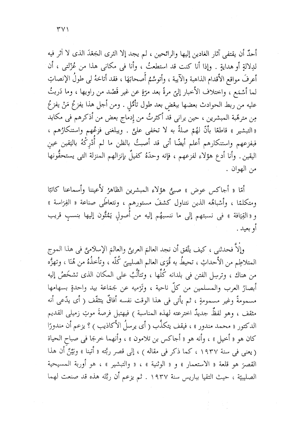 والا فحدثني كيف يتفق ان نجد العالم العربي والعالم الاسلامي في هذا الموج المتلاطم من الاحداث تحيط به قوي العالم الصليبي كله وتاخذه من هنا وتهزه من هناك وترسل الفتن في بلد انه كلها وتتالب على المكان الذي تشخص اليه ابصار العرب والمسلمين من كل ناحيه وترميه عن جماعه بيد واحده بسهامها مسمومه وغير مسمومه ثم ياتي في هذا الوقت نفسه افاق يتثقف اي يدعي انه مثقف وهو لفظ جديد اخترعته لهذه المناسبه فيهتبل فرصه موت زميلي القديم الدكتور محمد مندور فيقف يتكذب اي يرسل الأكاذيب يزعم ان مندورا كان هو اخيل وانه أجاكس بن تلامون وانهما خرجا في صباح الحياة يعني في سنة 1937 كما ذكر في مقاله الي قصر ربته "أتينا" وبين ان هذا القصر هو قلعة الاستعمار والوثنية والتبشير هو أوربة المسيحية الصليبية حيث التقيا بباريس سنة 1937. ثم يزعم أن ربّته هذه قد صنعت لهما