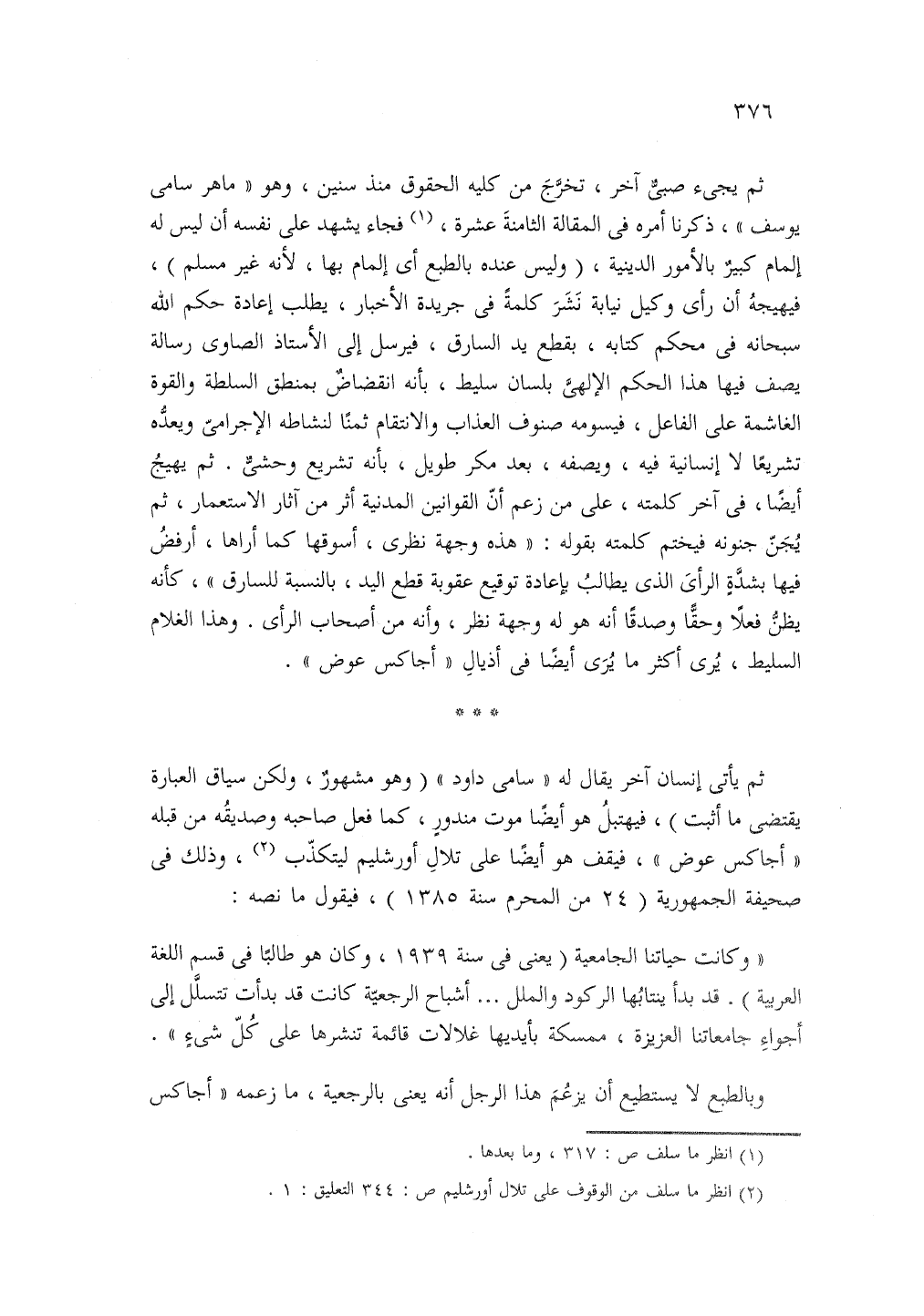 ثم يجئ صبي آخرلا تخرج من كلية الحقوق منذ سنين وهو ماهر سامي يوسف ذكرنا أمره في المقالة الثامنة عشرة فجاء يشهد على نفسه أنه ليس له إلمام كبير بالأمور الدينية وليس عنده بالطبع أي إلمام بها لأنه غير مسلم فيهيجه أن رأي وكيل نيابة نشر كلة\مة في جريدة الأخبار يطلب إعادة حكم الله سبحانع في محكم كتابه بقطع يد السارق فيرسل إلى الأستاذ الصاوي رسالة يصف فيها هذا الحكم الإلهي بلسان سليط بأنه انقضاض بمنطقة السلطة والقوة الغاشمة على الفاعل فيسومه صنوف العذاب والانتقام ثمنا لنشاطه الإجرامي ويعده تشريعا لا إنسانية فيه ويصفه بعد مكر طويل بأنه تشريع وحشي ثم يهيج أيضا في آخر كلمته على من زعم ان القوانين المنجينة أثر من آثار الاستعمار ثم يجن جنونه فيختم كلمته بقوله: هذه وجهة نظري أسوقها كما أراها أرفض فيها بشدة الرأي الذي يطالب بإعادة توقيع عقوبة قطع اليد بالنسبة للسارق كأنه يظن فعلا وحثقا وصدقتا أنه هو له وجهة نظر وأنه من أصحاب الرأي وهذا الغلام السليط يرى أكثر ما يرى أيضا في أذيال أجاكس عوض.