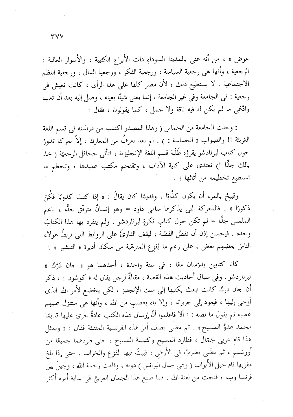 وقبيح بالمرء أن يكون كذابا وقديمًا كان يقال: إذا كنت كذوبا فكن ذكورا فالمعركة اتلتي يذكرها سامي داود = وهو إنسان مترفق جدا ناعم الملس جدا = لم تكن حول كتاب نكرة لبرناردشو ولم ينفرد بها هذا الكتاب وحده فيحسن إذن أن نقص القصة ليقف القارئ على الروابط التي تربط هؤلاء الناس بعضهم بعض على رغم ما يفزع المترهبة من سكان أديرة التبشير.