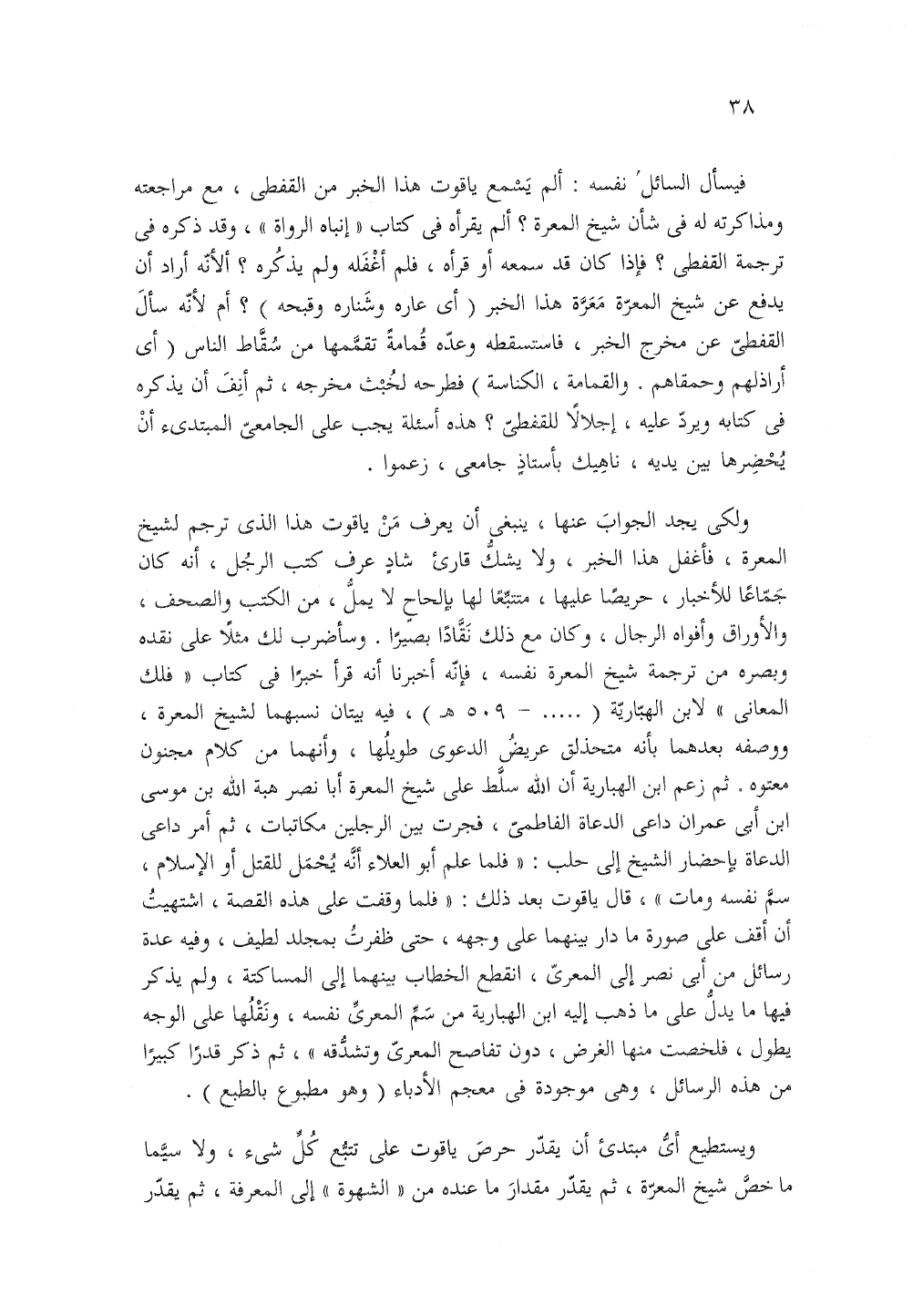 ولكي يجد الجواب عنها ينبغى أن يعرف من ياقوت هذا الذى ترجم لشيخ المعرة فأغفل هذا الخبر ولا يشك قارئ شاد عرف كتب الرجل أنه كان جماعا للأخبار حريصا عليها متتبعا لها بالحاح لا يمل من الكتب والصحف والأوراق وأفواه الرجال وكان مع ذلك نقادا بصيرا وسأضرب لك مثلا على نقده وبصره من ترجمة شيخ المعرة نفسه فانه أخبرنا أنه قرأ خبرا في كتاب فلك المعانى لابن الهبارية 0000 - 509 هـ فيه بيتان نسبهما لشيخ المعرة ووصفه بعدهما بأنه متحذلق عريض الدعوى طويلها وأنهما من كلام مجنون معتوه ثم زعم ابن الهبارية أن الله سلط على شيخ المعرة أبا نصر هبة الله بن موسى ابن أبى عمران داعى الدعاة الفاطمى فجرت بين الرجلين مكاتبات ثم أمر داعى الدعاة باحضار الشيخ إلى حلب فلما علم أبو العلاء أنه يحمل للقتل أو الإسلام سم نفسه ومات قال ياقوت بعد ذلك فلما وقفت على هذه القصة اشتهيت أن أقف على صورة ما دار بينهما على وجهه حتى ظفرت بمجلد لطيف وفيه عدة رسائل من ابى نصر إلى المعرى انقطع الخطاب بينهما إلى المساكتة ولم يذكر فيها ما يدل على ما ذهب اليه ابن الهبارية من سم المعرى نفسه ونقلهاعلى الوجه يطول فلخصت منها الغرض دون تفاصح المعرى وتشدقه ثم ذكر قدرا كبيرا من هذه الرسائل وهى موجودة في معجم الأدباء (وهو مطبوع بالطبع).