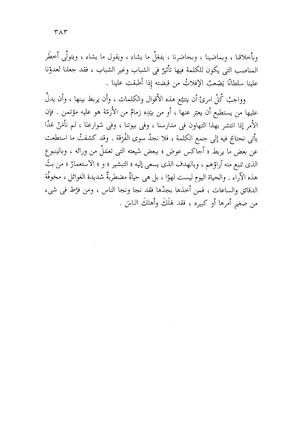 وواجب كل امرئ أن يتتبع هذه الأقوال والكلمات وأن يربط بينها وأن يدل عليها من يستطيع أن يعبر عنها أو من بيده زمام من الأزمة هو عليه مؤتمن فإن الأمر إذا انتشر بهذا التهاون في مدارسنا وفي بيوتنا وفي شوارعنا لم نأمن غدا يأتي نحتاج فيه إلى جمع الكلمة فلا نجد سوى الفرقة وقد كشفت ما استطعت عن بعض ما يربط أجامس عوض ببعض شيعته التي تعمل من ورائه وبالينبوع الذي تنبع منه آراؤهم وبالهدف الذي يسعى إليه التبشير والاستعمار من بث هذه الآراء والحياة اليوم ليست لهوا بل هي حياة مضطربة شديدة الغوائل مخوفة الدقائق والساعات فمن أخذها يجدها فقد نجا ونجا الناس ومن فرط في شيء من صغير أمرها أو كبيره، فقد هلك وأهلك الناس.