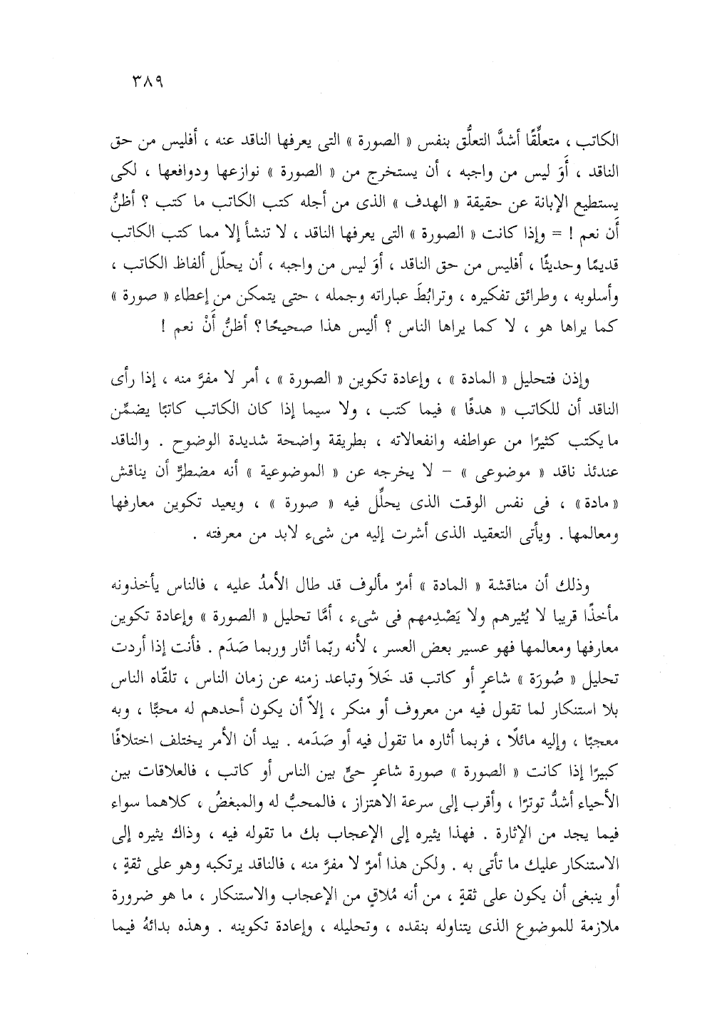 وذلك ان مناقشة المادة امر مالوف قد طال الامد عليه فالناس ياخذونه ماخذا قريبا لا يثيرهم ولا يصدمهم في شئ اما تحليل الصورة واعادة تكوين معارفها ومعالمها فهو عسير بعض العسر لأنه ربما اثار وربما صدم فانت إذا اردت تحليل صورة شاعر أو كاتب قد خلا وتباعد زمنه عن زمان الناس تلقاه الناس بلا استنكار لما تقول فيه من معروف أو منكر الا ان يكون احدهم له محبا وبه معجبا واليه مائلا فربما اثاره ما تقول فيه أو صدمه بيد ان الامر يختلف اختلافا كبيرا إذا كانت الصورة صور شاعر حى بين الناس أو كاتب فالعلاقات بين الاحياء أشد توترا واقرب إلى سرعة الاهتزاز فالمحب له والمبغض كلاهما سواء فيما يجد من الاثارة فهذا يثيره إلى الاعجاب بك ما تقوله فيه وذاك يثيره إلى الاستنكار عليك ما تاتى به ولكن هذا امر لا مفر منه فالناقد يرتكبه وهو على ثقة أو ينبغى ان يكون على ثقة من انه ملاق من الاعجاب والاستنكار ما هو ضرورة ملازمة للموضوع الذى يتناوله بنقده وتحليله واعاده تكوينه. وهذه بدائهُ فيما