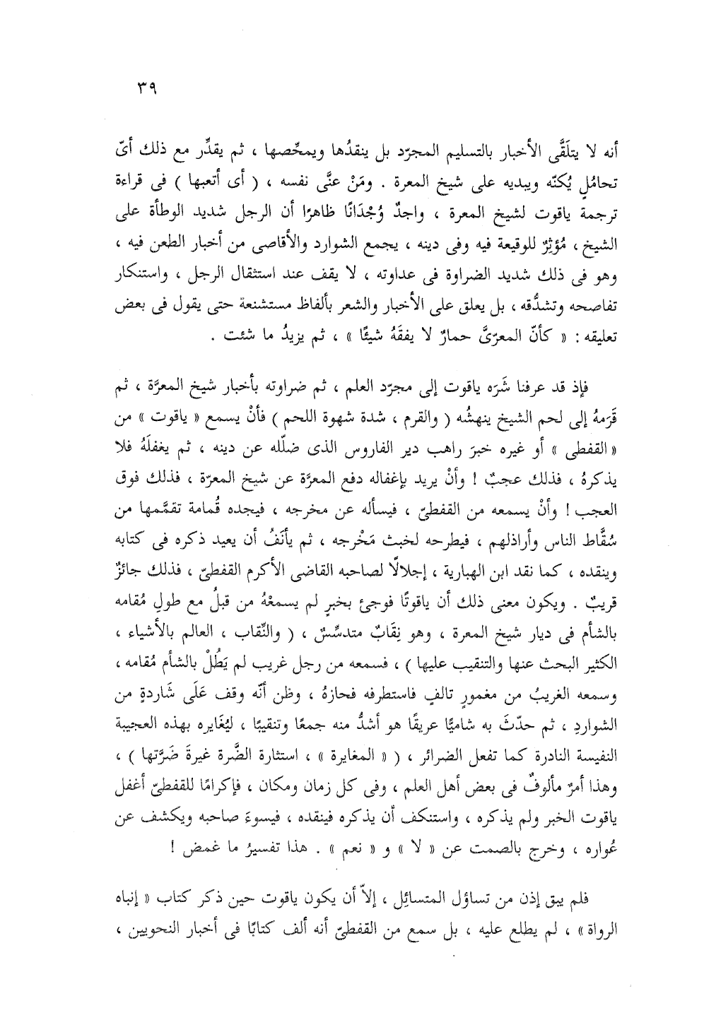 أنه لا يتلقى الأخبار بالتسليم المجرد بل ينقدها ويمحصها ثم يقدر مع ذلك أي تحامل يكنه ويبديه على شيخ المعرة ومن عنى نفسه أي أتعبها في قراءة ترجمة ياقوت لشيخ المعرة واجد وجدانا ظاهرا أن الرجل شديد الوطأه على الشيخ مؤثر للوقيعة فيه وفي دينه يجمع الشوارد والأقاصى من أخبار الطعن فيه وهو في ذلك شديد الضرورة في عداوته لا يقف عند استثقال الرجل واستنكار تفاصحه وتشدقه بل يعلق على الأخبار والشعر بألفاظ مستشنعة حتى يقول في بعض تعليقه كأن المعرى حمار لا يفقه شيئا ثم يزيد ما شئت.