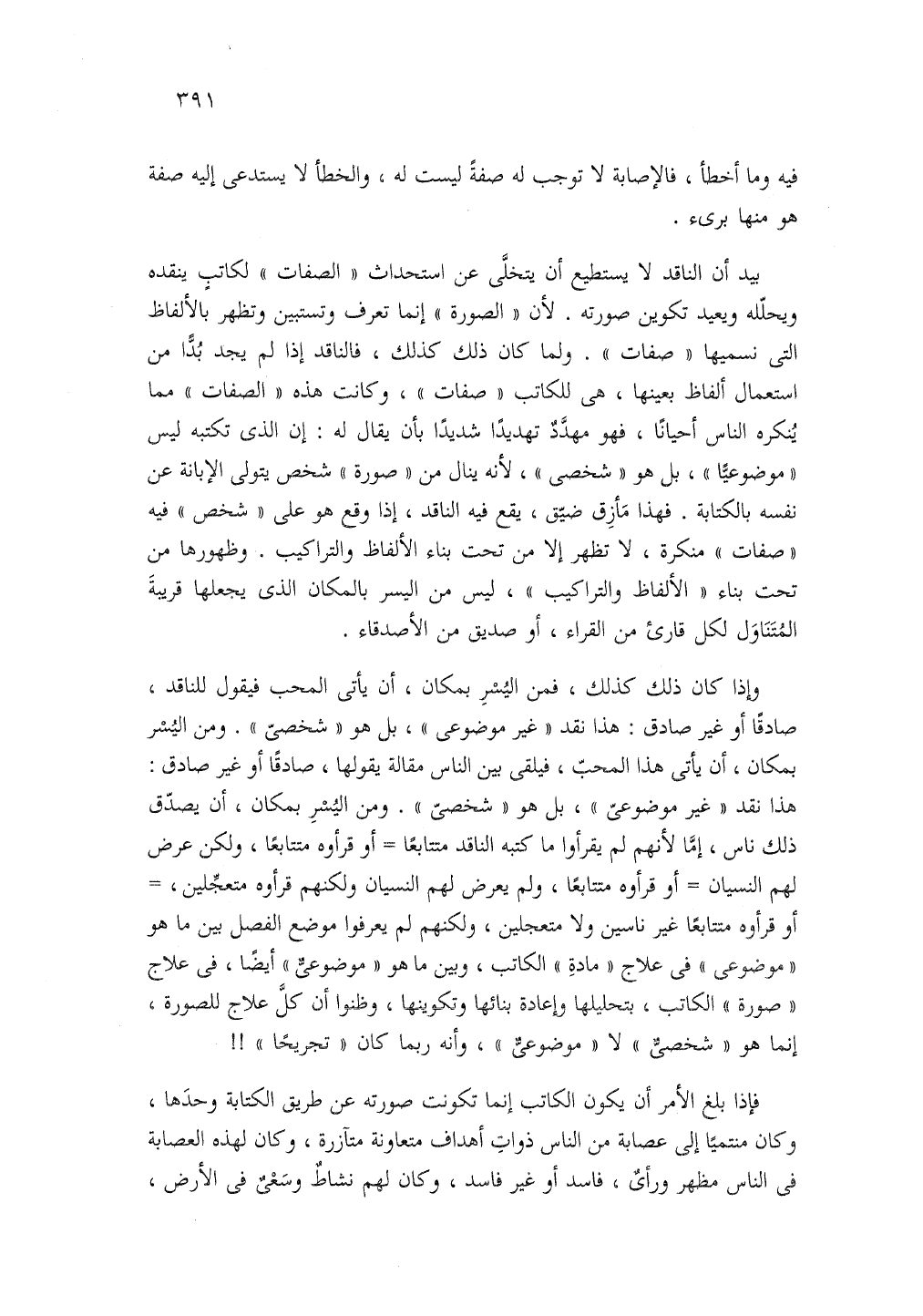 بيد ان الناقد لا يستطيع ان يتخلى عن استحداث الصفات لكاتب ينقده ويحلله ويعيد تكوين صورته لان الصورة انما تعرف وتستبين وتظهر بالالفاط التي نسميها صفات ولما كان ذلك كذلك فالناقد إذا لم يجد بدا من استعمال ألفاظ بعينها هي للكاتب صفات وكانت هذه الصفات مما ينكره الناس أحيانًا فهو مهدد تهديدا شديدا بان يقال له ان الذى تكتبه ليس موضوعيا بل هو شخصى لأنه ينال من صورة شخص يتولى الابانة عن نفسه بالكتابة فهذا مازق ضيق يقع فيه الناقد إذا وقع هو على شخص فيه صفات منكرة لاتظهر الا من تحت بناء الألفاظ والتراكيب وظهورها من تحت بناء الألفاظ والتراكيب ليس من اليسر بالمكان الذى يجعلها قريبة المتنأول لكل قارى من القراء اوصديق من الاصدقاء.