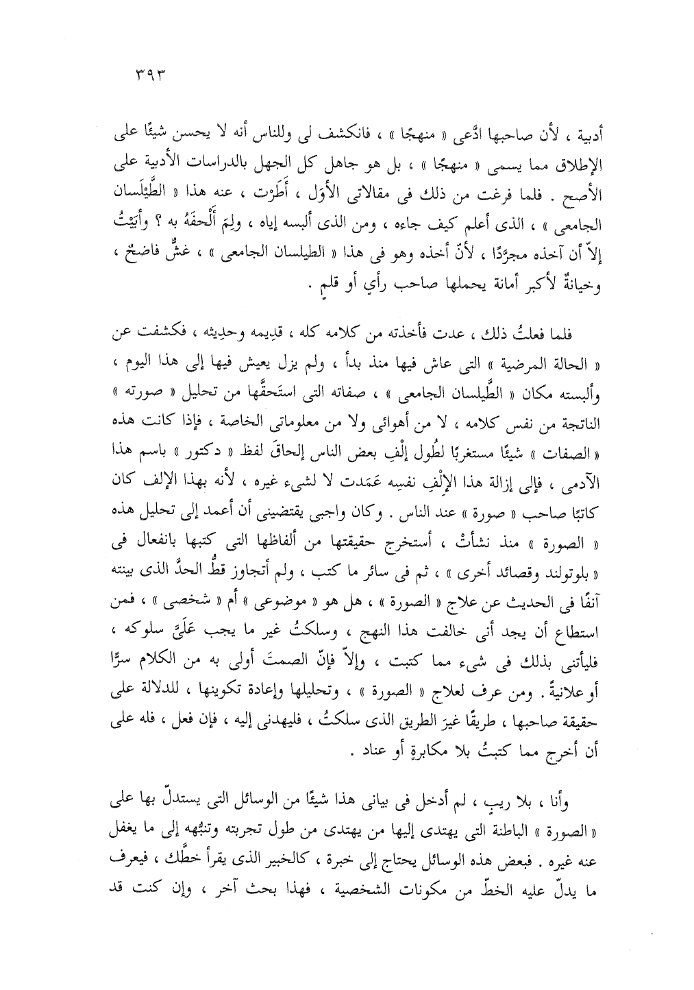 فلما فعلت ذلك عدت فاخذته من كلامه كله قديمه وحديثه فكشفت عن الحالة المرضية التي عاش فيها منذ بدا ولم يزل يعيش فيها إلى هذا اليوم والبسته مكان الطيلسان الجامعى صفاته التي استحقها من تحليل صورته الناتجة من نفس كلامه لا من اهوائى ولا من معلوماتى الخاصة فاذا كانت هذه الصفات شيئا مستغربا لطول الف بعض الناس الحاق لفظ دكنور باسم هذا الادمى فالى هذا الالف نفسه عمدت لا لشئ غيره لأنه بهذا الالف كان كاتبا صاحب صورة عند الناس وكان واجبى يقتضينى ان اعمد إلى تحليل هذه الصورة منذ نشات استخرج حقيقتها من الفاظها التي كتبها بانفعال في "بلوتولند" وقصائد أخرى ثم في سائر ما كتب ولم اتجاوز قط الحد الذى بينته انفا في الحديث عن علاج الصورة هل هو موضوعى ام شخصى فمن استطاع ان يجد انى خالفت هذا النهج وسلكت غير ما يجب على سلوكه فلياتنى بذلك بذلك في شئ مما كتبت والا فان الصمت اولى به من الكلام سرا أو علانية ومن عرف لعلاج الصورة وتحليلها واعادة تكوينها للدلالة على حقيقة صاحبها طريقا غير الطريق الذى سلكت فليهدينى اليه فان فعل فله على ان اخرج مما كتبت بلا مكابرة أو عناد.