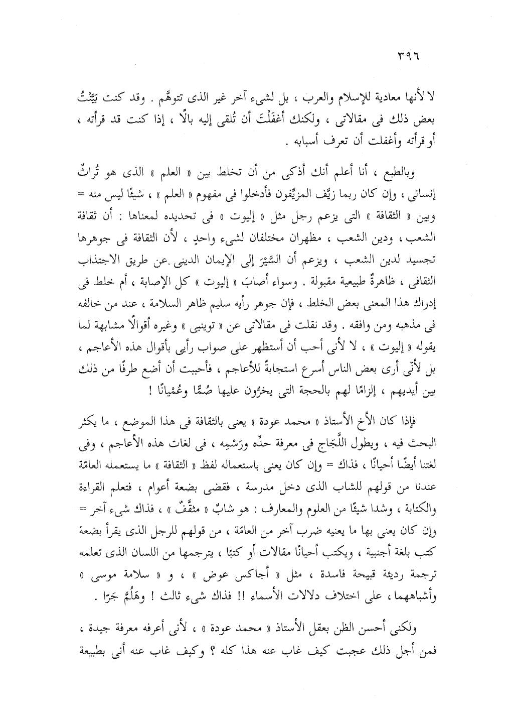وبالطبع انا اعلم انك اذكى من ان تخلط بين العلم الذى هو تراث انسانى وان كان ربما زيف المزيفون فادخلوا في مفهوم العلم شيئا ليس منه وبين الثقافة التي يزعم رجل مثل اليوت في تحديده لمعناها ان ثقافة الشعب ودين الشعب مظهران مختلفان لشئ واحد لان الثقافة في جوهرها تجسيد لدين الشعب ويزعم ان السير إلى الايمان الدينى عن طريق الاجتذاب الثقافي ظاهرة طبيعية مقبولة وسواء اصابت اليوت كل الاصابة ام خلط في ادراك هذا المعنى بعض الخلط فان جوهر رايه سليم ظاهر السلامة عند من خالفه في مذهبه ومن وافقه وقد نقلت في مقالاتى عن توينبى وغيرة اقوالا مشابهة لما يقول اليوت لا لانى أحب ان استظهر على صواب رايى باقواله هذه الأعاجم بل لانى ارى بعض الناس اسرع استجابه للاعاجم فاحببت ان اضع طرفا من ذلك بين ايديهم الزاما لهم بالحجة التي يخرون عليها صما وعميانا!