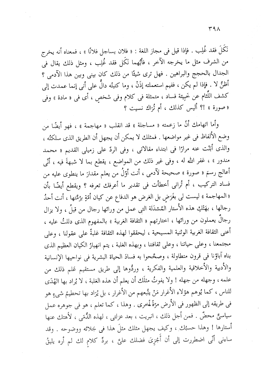 وأما اتهامك ان ما زعمتة مساجلة قد انقلب مهاجمة فهو أيضًا من وضع الألفاظ في غير مواضيعها فمثلك لايمكن ان يجهل ان الطريق الذى سلكته والذى ابنت عنه مرارا في ابتداء مقالاتى وفي الرد على زميلى القديم محمد مندور غفر الله له وفي غير ذلك من المواضع يقطع بم لا شبهة فيه انى اعالج رسم صورة صحيحة لادمى انت أول من يعلم مقدار ما ينطوى عليه من فساد التركيب ام ترانى اخطات في تقدير ما اعرفك تعرفه ويقطع أيضًا بان المهاجة ليست لى بغرض بل الغرض هو الدفاع عن كيان امة برمتها انت احد رجالها بهتك هذه الاستار المسدلة التي تعمل وراها رجال من قبل ولا يززال رجال يعملون من ورائها اختارتهم الثقافة الغربية بالمفهوم الذى دللت عليه اعنى الثقافة الغربية الوثنية المسيحية ليحققوا لهذه الثقافة غلبه على عقولنا وعلى مجتمعنا وعلى حياتنا وعلى ثقافتنا وبهذه الغلبة يتم انهيار الكيان العظيم الذى بناه اباؤنا في قرون متطاولة وصححوا به فساد الحياة البشرية في نواحيها الانسانية والأدبية والاخلاقية والعملية والفكرية وردوها إلى طريق مستقيم علم ذلك من علمه وجهله من جهله ولا يفوت مثلك ان يعلم ان هذه الغلبة لا يراد بها الهدى للناس كما يوهم هؤلاء الاغرار من يتبعهم من الاغرار بل يزداد بها تحطيم شئ هو في طريقة إلى الظهور في الأرض مرة أخرى وهذا كما تعلم هو في جوهرة عمل سياسى محض فمن أجل ذلك انبريت بعد عزلتى لهذه الدمى لاهتك عنها استارها وهذا حسبك وكيف يجهل مثلك هذا في جلائه ووضوحة وقد ساءنى انى اضطررت إلى ان أَجْزِى فضلك علىَّ، بردّ كلام لك لم اره يليق