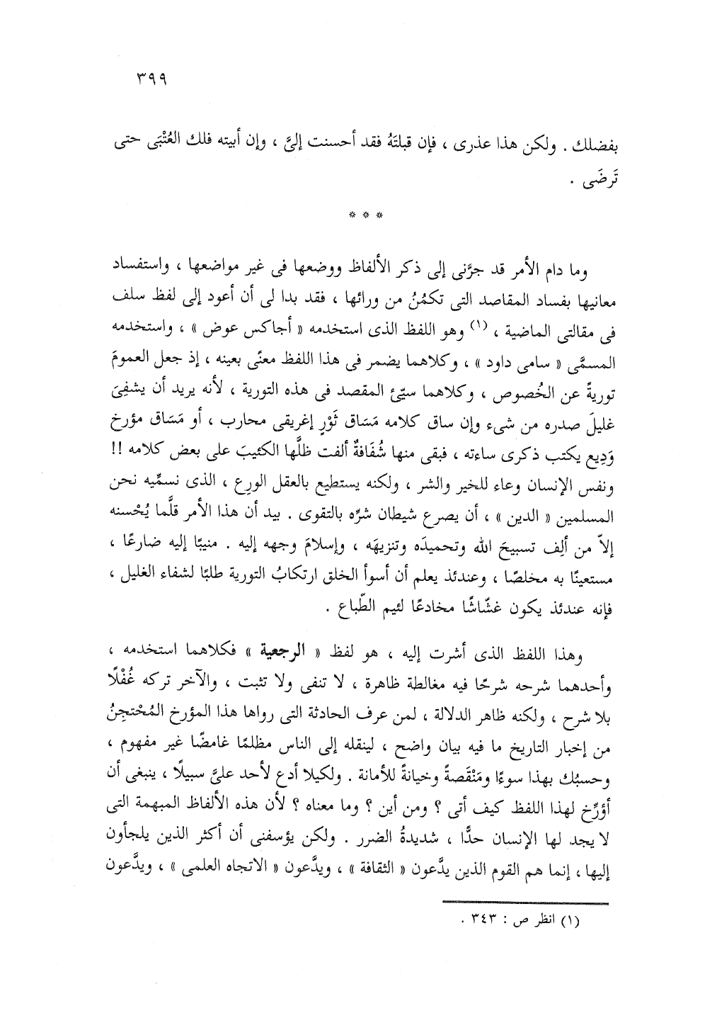 وهذا اللفظ الذى اشرت اليه هو لفظ الرجعية فكلاهما استخدمه واحدهما شرحه شرحا فيه مغالطة ظاهرة لاتنفى ولا تثبت والآخر تركه غفلا بلا شرح ولكنه ظاهر الدلالة لمن عرف الحادثة التي رواها هذا المؤرخ المحتجن من اخبار التاريخ ما فيه بيان واضح لينقله إلى الناس مظلما غامضا غير مفهوم وحسبك بهذا سوءا ومنقضة وخيانة للامانة ولكيلا ادع لاحد على سبيلا ينبغى ان اؤرخ لهذا اللفظ كيف اتى ومن اين وما معناه لان هذه الألفاظ المبهمة التي لا يجد لها الانسان حدا، شديدة الضرر. ولكن يؤسفني أن أكثر الذين يلجاون اليها انما هم القوم الذين يدعون الثقافة ويدعون الاتجاه العلمى ويدعون