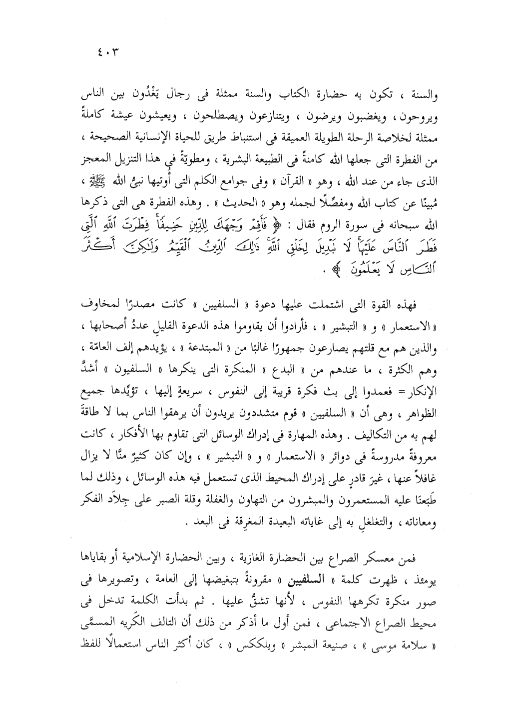 فمن معسكر الصراع بين الحضارة الغازية، وبين الحضارة الإسلامية أوبقاياها يومئذ، ظهرت كلمة "السلفيين" مقرونة بتبغيضها إلى العامة، وتصوريها في صور منكرة تكرها النفوس، لأنها تشق عليها. ثم بدأت الكلمة تدخل في محيط الصراع الاجتماعى، فمن أول ما أذكر من ذلك أن التالف الكرية المسمى "سلامة موسى"، صنيعة المبشر "ويلككس"، كان أكثر الناس استعمالا للفظ