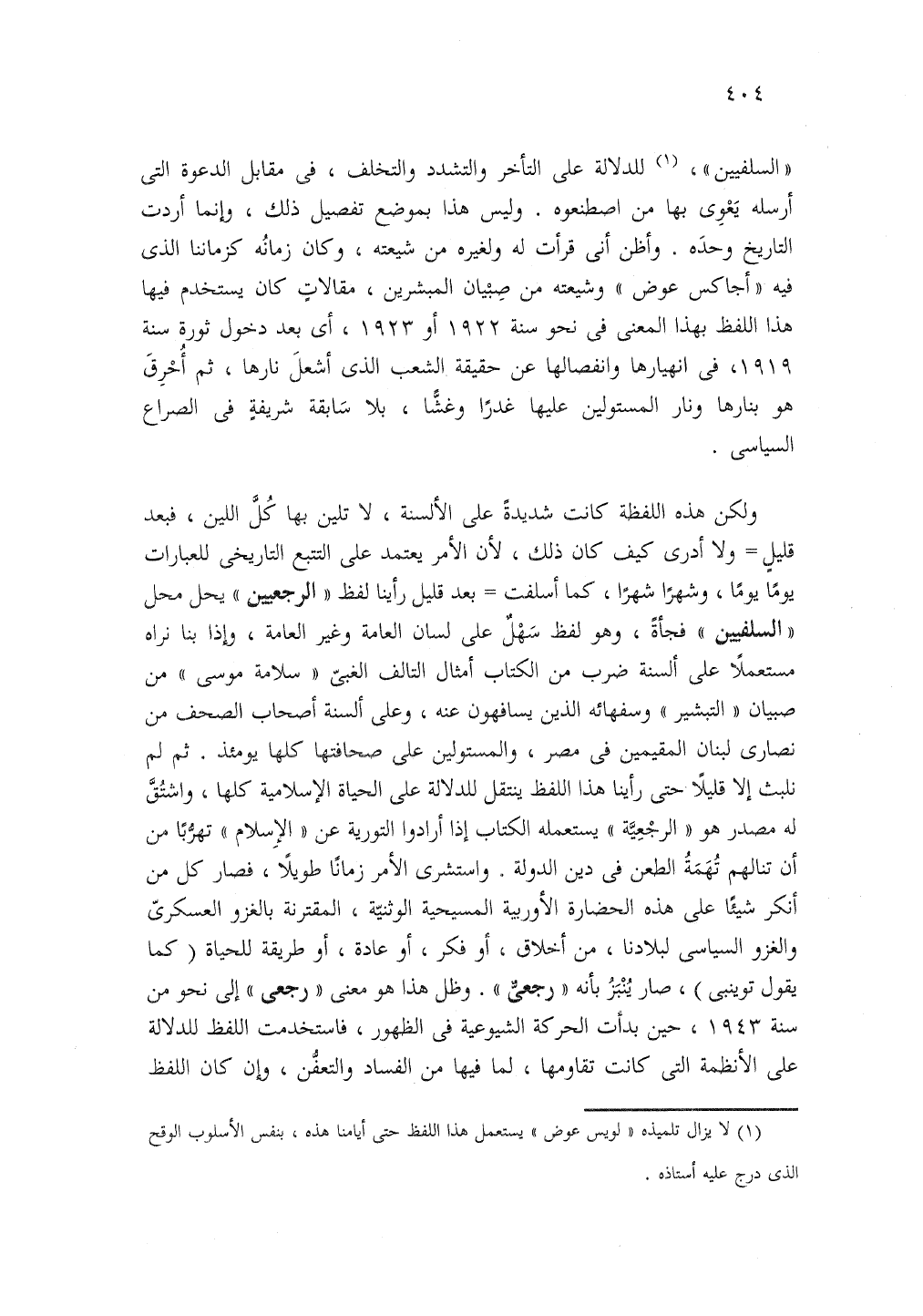 "السلفيين"، (1) للدلالة على التأخير والتشدد والتخلف، في مقابل الدعوة التي أرسله يعوى من اصطنعوه. وليس هذا بموضوع تفصيل ذلك، وإنما أردت التاريخ وحده. وأظن أنى قرأت له ولغيره من شيعته، وكان زمانه كزماننا الذى فيه "أجاكس عوض" وشيعته من صبيان المبشرين، مقالات كان يستخدم فيها هذا اللفظ بهذا المعنى في نحو سنة 1992 أو 1923، أي بعد دخول ثورة سنة 1919، في انهيارها وانفصالها عن حقيقة الشعب الذى أشعل نارها، ثم أحرق هو بنارها ونار المستولين عليها غدرا وغشا، بلا سابقة شريفة في الصراع السياسى.