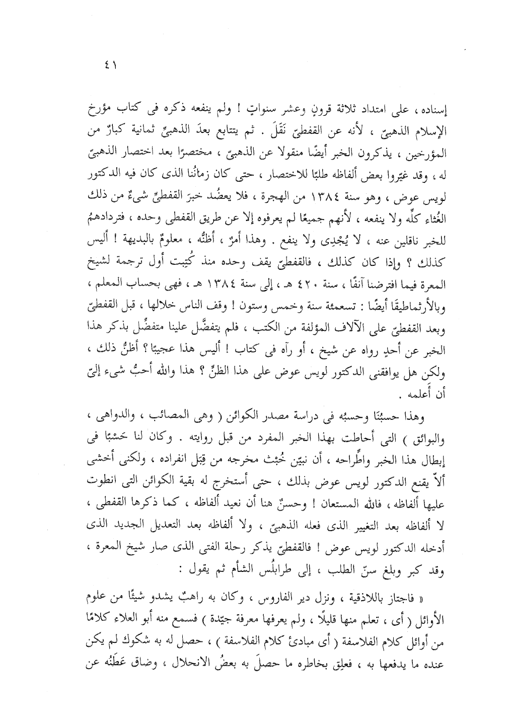 اسناده على امتداد ثلاثة قرون وعشر سنوات ولم ينفعه ذكره في كتاب مؤرخ الإسلام الذهبى لأنه عن القفطى نقل ثم يتتابع بعد الذهبى ثمانية كبار من المؤرخين يذكرون الخبر أيضا منقولا عن الذهبى مختصرا بعد اختصار الذهبى له وقد غيروا بعض الفاظه طلبا للاختصار حتى كان زماننا الذى كان فيه الدكتور لويس عوض وهو سنة 1384 من الهجرة فلا يعضد خبر القفطى وحده فتردادهم للخبر ناقلين عنه لا يجدى ولا ينفع وهذا أمر أظنه معلوم بالبديهة أليس كذلك واذا كان كذلك فالقفطى يقف وحده منذ كتبت أول ترجمة لشيخ المعرة فيما افترضنا انفا سنة 420 هـ إلى سنة 1384 هـ فهي بحساب المعلم وبالأرثماطيقا أيضا تسعمئه سنة وخمس وستون وقف الناس خلالها قبل القفطى وبعد القفطى على الالاف المؤلفة من كتب فلم يتفضل علينا متفضل بذكر هذا الخبر عن أحد رواه عن شيخ أو راه في كتاب أليس هذا عجيبا أظن ذلك ولكن هل يوافقنى الدكتور لويس عوض على هذا الظن هذا والله أحب شئ إلى أن أعلمه.