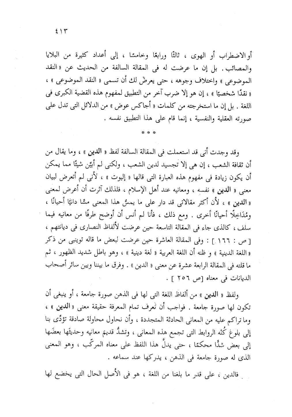وقد وجدت أني قد استعملت في المقالة السالفة لفظ الدين وما يقال من أن ثقافة الشعب إن هي إلا تجسيد لدين الشعب ولكني لم أبين شيئا مما يمكن أن يكون زيادة في مفهوم هذه العبارة التي قالها إليوت لأني لم أتعرض لبيان معني الدين نفسه ومعانيه عند أهل الإسلام فلذلك آثرت أن أعرض لمعني الدين لأن أكثر مقالاتي قد دار على ما يمس هذا المعني مسا دانيا أحيانا ومداخلا أحيانا أخري ومع ذلك فأنا لم أنس أن أوضح طرفا من معانيه فيما سلف كالذي جاء في المقالة التاسعة حين عرضت لألفاظ النصارى في ديانتهم (ص 166) وفي المقالة العاشرة حين عرضت لبعض ما قاله توينبي من ذكر اللغة الدينية وظنه أن اللغة العربية لغة دينية وهو باطل شديد الظهور ثم ما قلته في المقالة الرابعة عن معني الدين وفرق ما بيننا وبين سائر أصحاب الديانات في معناه (ص 256).