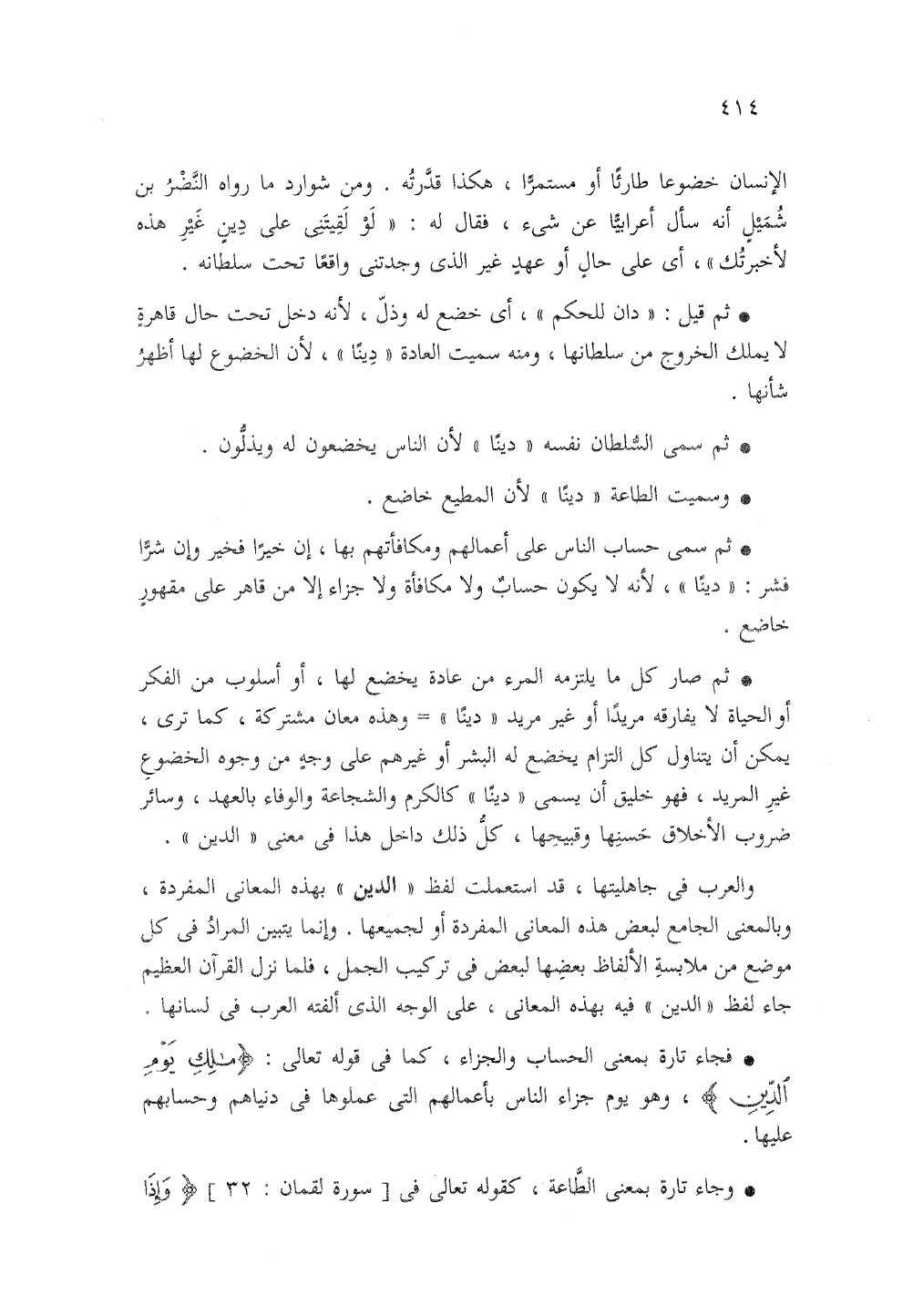 * ثم صار كل ما يلتزمه المرء من عادة يخضع لها أو أسلوب من الفكر أو الحياة لا يفارقه مريدا أو غير مريد دينا وهذه معان مشتركة كما تري يمكن أن يتنأول كل التزام يخضع له البشر أو غيرهم على وجه من وجوه الخضوع غير المريد فهو خليق أن يسمي دينا كالكرم والشجاعة والوفاء بالعهد وسائر ضروب الأخلاق حسنها وقبيحها كل ذلك داخل هذا في معني الدين.