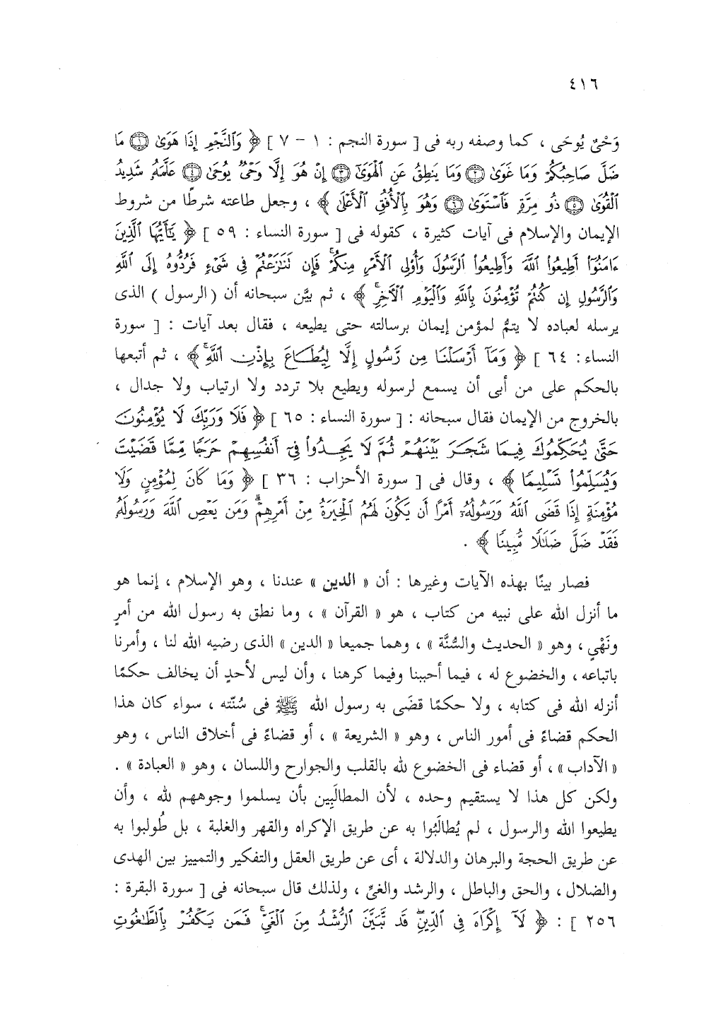 وَحْيٌ يُوحَى كما وصفه ربه في سورة النجم {وَالنَّجْمِ إِذَا هَوَى (1) مَا ضَلَّ صَاحِبُكُمْ وَمَا غَوَى (2) وَمَا يَنْطِقُ عَنِ الْهَوَى (3) إِنْ هُوَ إِلَّا وَحْيٌ يُوحَى (4) عَلَّمَهُ شَدِيدُ الْقُوَى (5) ذُو مِرَّةٍ فَاسْتَوَى (6) وَهُوَ بِالْأُفُقِ الْأَعْلَى (7)} [النجم: 1 - 7]، وجعل طاعته شرطا من شروط الإيمان والإسلام في آيات كثيرة كقوله في سورة النساء {يَاأَيُّهَا الَّذِينَ آمَنُوا أَطِيعُوا اللَّهَ وَأَطِيعُوا الرَّسُولَ وَأُولِي الْأَمْرِ مِنْكُمْ فَإِنْ تَنَازَعْتُمْ فِي شَيْءٍ فَرُدُّوهُ إِلَى اللَّهِ وَالرَّسُولِ إِنْ كُنْتُمْ تُؤْمِنُونَ بِاللَّهِ وَالْيَوْمِ الْآخِرِ} [النساء: 59]، ثم بين سبحانه أن الرسول الذي يرسله لعباده لا يتم لمؤمن إيمان برسالته حتى يطيعه فقال بعد آيات سورة النساء {وَمَا أَرْسَلْنَا مِنْ رَسُولٍ إِلَّا لِيُطَاعَ بِإِذْنِ اللَّهِ} [النساء: 64]، ثم أتبعها بالحكم على من أبي أن يسمع لرسوله ويطيع بلا تردد ولا ارتياب ولا جدال بالخروج من الإيمان فقال سبحانه سورة النساء {فَلَا وَرَبِّكَ لَا يُؤْمِنُونَ حَتَّى يُحَكِّمُوكَ فِيمَا شَجَرَ بَيْنَهُمْ ثُمَّ لَا يَجِدُوا فِي أَنْفُسِهِمْ حَرَجًا مِمَّا قَضَيْتَ وَيُسَلِّمُوا تَسْلِيمًا} [النساء: 65]، وقال في سورة الأحزاب {وَمَا كَانَ لِمُؤْمِنٍ وَلَا مُؤْمِنَةٍ إِذَا قَضَى اللَّهُ وَرَسُولُهُ أَمْرًا أَنْ يَكُونَ لَهُمُ الْخِيَرَةُ مِنْ أَمْرِهِمْ وَمَنْ يَعْصِ اللَّهَ وَرَسُولَهُ فَقَدْ ضَلَّ ضَلَالًا مُبِينًا} [الأحزاب: 36].