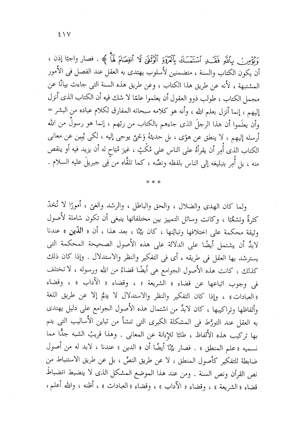 ولما كان الهدي والضلال والحق والباطل والرشد والغي أمورا لا تحد كثرة وتشعبا وكانت وسائل التمييز بين مختلفاتها ينبغي أن تكون شاملة لأصول وثيقة محكمة على اختلافها وتباينها كان بينا بعد هذا أن الدين عندنا لابد أن يشتمل أيضا على الدلالة على هذه الأصول الصحيحة المحكمة التي يسترشد بها العقل في طريقه أي في التفكير والنظر والاستدلال وإذا كان ذلك كذلك كانت هذه الأصول الجوامع هي أيضا قضاء من الله ورسوله لا تختلف في وجوب إتباعها عن قضاء الشريعة وقضاء الآداب وقضاء العبادات وإذا كان التفكير والنظر والاستدلال لا يتم إلا عن طريق اللغة وألفاظها وتراكيبها كان لابد من اشتمال هذه الأصول الجوامع على دليل يهتدي به العقل عند التورط في المشكلة الكبرى التي تنشأ من تباين الأساليب التي يتم بها تركيب هذه الألفاظ طلبا للإبانة عن المعاني وهذا قريب الشبه جدا مما نسميه علم المنطق فصار بيننا أيضا أن الدين عندنا لابد له من أصول ضابطة للتفكير كأصول المنطق لا عن طريق النص بل عن طريق الاستنباط من نص القرآن ونص السنة ومن عند هذا الموضع المشكل الذي لا ينضبط انضباطا قضاء الشريعة وقضاء الآداب وقضاء العبادات أظنه والله أعلم
