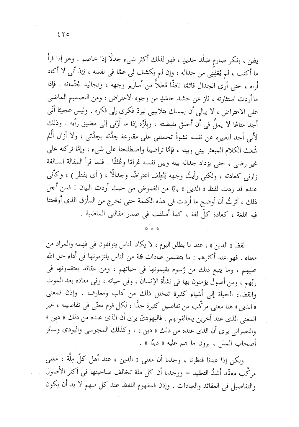يظن بفكر صارم صلد حديد فهو لذلك أكثر شئ جدلا إذا خاصم وهو إذا قرأ ما أكتب لم يعفني من جداله وإن لم يكشف لي عما في نفسه بيد أني لا أكاد أراه حتى أري الجدال قائما نافذا مطلا من أسارير وجهه وتجاليد جثمانه فإذا ما أردت استثارته ثار عن حشد حاشد من وجوه الاعتراض ومن التصميم الماضي على الاعتراض لا يبالي أن يمسك بتلابيبي ليرد فكري إلي فكره وليس عجيبا أني أجد متاعا لا يمل في أن أحس بقبضته وبلزه إذا ما لزني إلي مضيق رأيه وذلك لأني أجد لتعبيره عن نفسه نشوة تحملني على مقارعة حدته بحدتي ولا أزال ألم شعث الكلام المبعثر بيني وبينه فإما تراضينا واصطلحنا على شئ وإما تركته على غير رضي حتى يزداد جداله بينه وبين نفسه عراما وعنفا فلما قرأ المقالة السالفة زارني كعادته ولكني رأيت وجهه ينطف اعتراضا وجدالا أي يقطر وكأني عنده قد زدت لفظ الدين بابا من الغموض من حيث أردت البيان فمن أجل ذلك آثرت أن أوضح ما أردت في هذه الكلمة حتى نخرج من المأزق الذي أوقعتنا فيه اللغة كعادة كل لغة كما أسلفت في صدر مقالتي الماضية.
