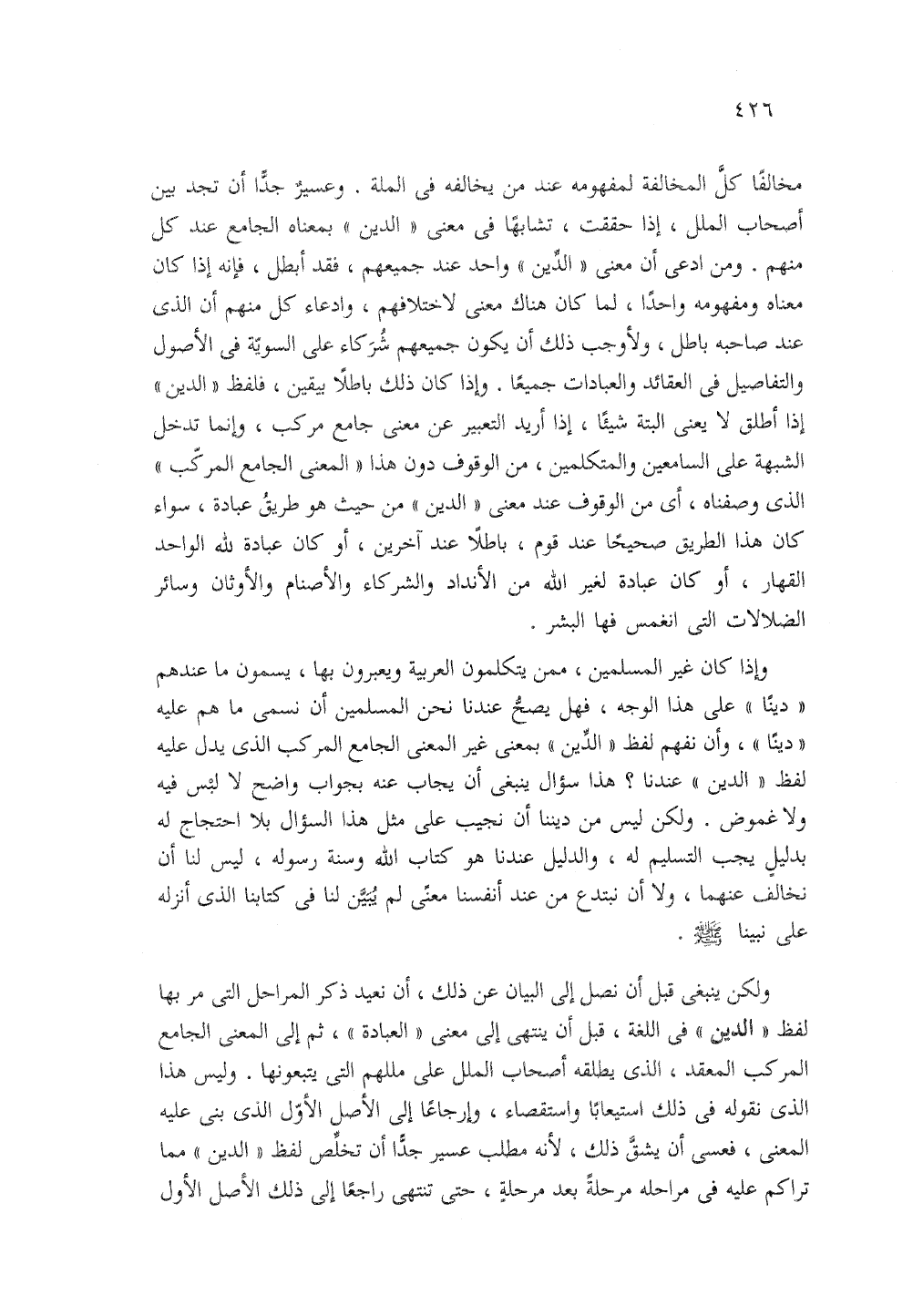 وإذا كان غير المسلمين ممن يتكلمون العربية ويعبرون بها يسمون ما عندهم دينا على هذا الوجه فهل يصح عندنا نحن المسلمين أن نسمي ما هم عليه دينا وأن نفهم لفظ الدين بمعني غير المعني الجامع المركب الذي يدل عليه لفظ الدين عندنا هذا السؤال ينبغي أن يجاب عنه بجواب واضح لا لبس فيه ولا غموض ولكن ليس من ديننا أن نجيب على مثل هذا السؤال بلا احتجاج له بدليل يجب التسليم له والدليل عندنا هو كتاب الله وسنة رسوله ليس لنا أن نخالف عنهما ولا أن نبتدع من عند أنفسنا معني لم يبين لنا في كتابنا الذي أنزله على نبينا محمد صلى الله عليه وسلم.