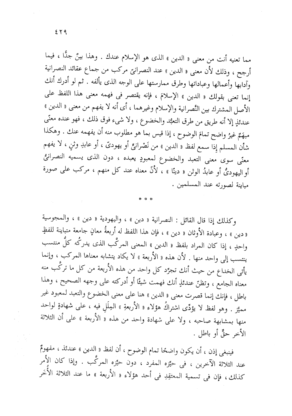 فينبغي إذن أن يكون واضحا تمام الوضوح أن لفظ الدين عندئذ مفهوم عند الثلاثة الآخرين في حيزه المفرد دون حيزه المركب وإذا كان الأمر كذلك فإن في تسمية المعتقد في أحد هؤلاء الأربعة ما عند الثلاثة الأُخَر