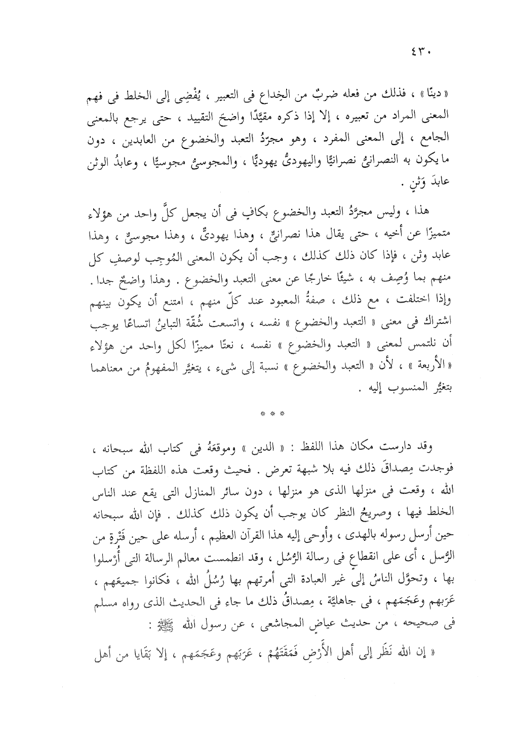 وقد دارست مكان هذا اللفظ الدين وموقعه في كتاب الله سبحانه فوجدت مصداقا ذلك فيه بلا شبهة تعرض فحيث وقعت هذه اللفظة من كتاب الله وقعت في منزلها الذي هو منزلها دون سائر المنازل التي يقع عند الناس الخلط فيها وصريح النظر كان يوجب أن يكون ذلك كذلك فإن الله سبحانه حين أرسل رسوله بالهدي وأوحي إليه هذا القرآن العظيم أرسله على حين فترة من الرسل أي على انقطاع في رسالة الرسل وقد انطمست معالم الرسالة التي أرسلوا بها وتحول الناس إلي غير العبادة التي أمرتهم بها رسل الله فكانوا جميعهم غربهم وعجمهم في جاهلية مصداق ذلك ما جاء في الحديث الذي رواه مسلم في صحيحه، من حديث عياض المجاشعي عن رسول الله صلى الله عليه وسلم: