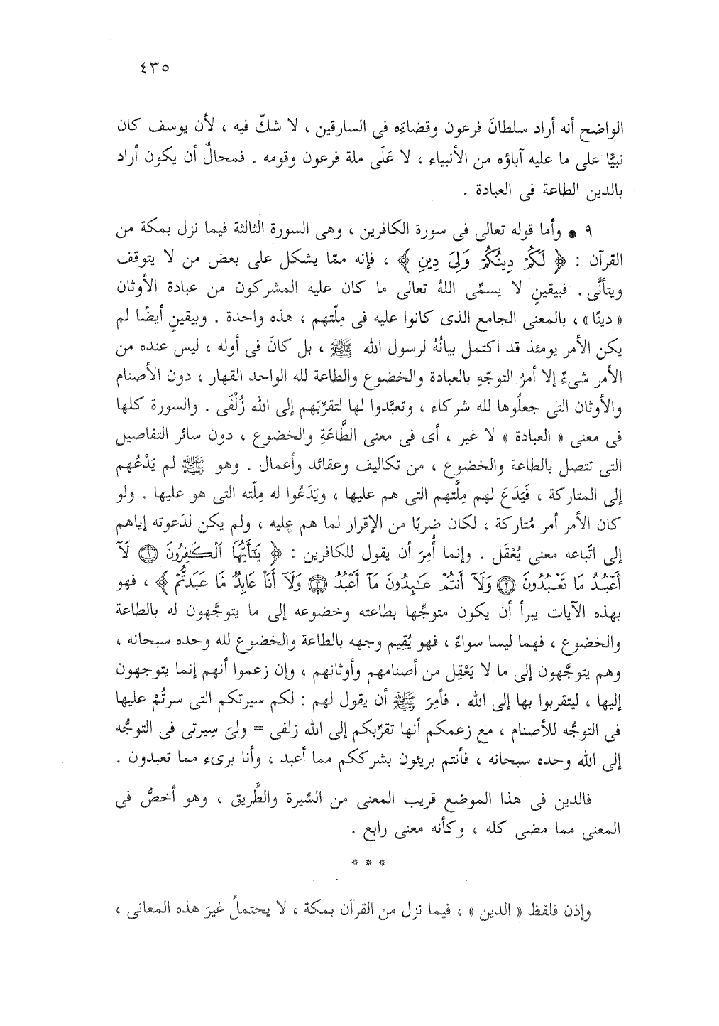 9 - وأما قوله تعالى في سورة الكافرين وهي السورة الثالثة فيما نزل بمكة من القرآن {لَكُمْ دِينُكُمْ وَلِيَ دِينِ} [الكافرون: 6]، فإنه مما يشكل على بعض من لا يتوقف ويتأني فبيقين لا يسمي الله تعالي ما كان عليه المشركون من عبادة الأوثان دينا بالمعني الجامع الذي كانوا عليه في ملتهم هذه واحدة وبيقين أيضا لم يكن الأمر يومئذ قد اكتمل بيانه لرسول الله صلى الله عليه وسلم بل كان في أوله ليس عنده من الأمر شئ إلا أمر التوجه بالعبادة والخضوع والطاعة لله الواحد القهار دون الأصنام والأوثان التي جعلوها لله شركاء وتعبدوا لها لتقربهم إلي الله زلفي والسورة كلها في معني العبادة لا غير أي في معني الطاعة والخضوع دون سائر التفاصيل التي تتصل بالطاعة والخضوع من تكاليف وعقائد وأعمال وهو صلى الله عليه وسلم لم يدعهم إلي المتاركة فيدع لهم ملتهم التي هم عليها ويدعوا له ملته التي هو عليها ولو كان الأمر أمر متاركة لكان ضربا من الإقرار لما هم عليه ولم يكن لدعوته إياهم إلي اتباعه معني يعقل وإنما أمر أن يقول للكافرين {يَاأَيُّهَا الْكَافِرُونَ (1) لَا أَعْبُدُ مَا تَعْبُدُونَ (2) وَلَا أَنْتُمْ عَابِدُونَ مَا أَعْبُدُ (3) وَلَا أَنَا عَابِدٌ مَا عَبَدْتُمْ (4)} [الكافرون: 1 - 4] فهو بهذه الآيات يبرأ أن يكون متوجها بطاعته وخضوعه إلي ما يتوجهون له بالطاعة والخضوع فهما ليسا سواء فهو يقيم وجهه بالطاعة والخضوع لله وحده سبحانه وهو يتوحهون إلي ما لا يعقل من أصنامهم وأوثانهم وإن زعموا أنهم إنما يتوجهون إليها ليتقربوا بها إلي الله فأمر صلى الله عليه وسلم أن يقول لهم لكم سيرتكم التي سرتم عليها في التوجه للأصنام مع زعمكم أنها تقربكم إلي الله زلفي = وليّ سيرتي في التوجه إلي الله وحده سبحانه فأنتم بريئون بشرككم مما أعبد وأنا برئ مما تعبدون.