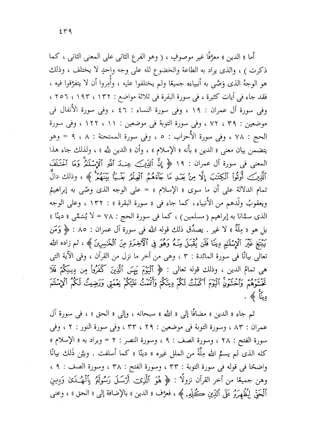 أما "الدين" معرفا غير موصوف، وهو الفرع الثاني على المعني الثاني كما ذكرت والذي يراد به الطاعة والخضوع لله على وجه واحد لا يختلف وذلك هو الوجه الذي وصي به أنبياءه جميعا ولم يختلفوا عليه وأمروا أن لا يتفرقوا فيه فقد جاء في آيات كثيرة في سورة البقرة في ثلاثة مواضع 132 193 256 وفي سورة آل عمران 19 وفي سورة النساء 46 وفي سورة التوبة في موضعين 11 122 وفي سورة الحج 78 وفي سورة الأحزاب 5 وفي سورة الممتحنة 8 9 وهو يتضمن بيان معني الدين بأنه الإسلام وأن الدين لله ولذلك جاء هذا المعني في سورة آل عمران {إِنَّ الدِّينَ عِنْدَ اللَّهِ الْإِسْلَامُ وَمَا اخْتَلَفَ الَّذِينَ أُوتُوا الْكِتَابَ إِلَّا مِنْ بَعْدِ مَا جَاءَهُمُ الْعِلْمُ بَغْيًا بَيْنَهُمْ} [آل عمران: 19] وذلك دال تمام الدلالة على أن ما سوي الإسلام على الوجه الذي وصي به إبراهيم ويعقوب ولدهم من الأنبياء كما جاء في سورة البقرة 132 وعلي الوجه الذي سمانا به إبراهيم مسلمين كما في سورة الحج 78 لا يسمي دينا بل هو ملة لا غير يصدق ذلك قوله الله تعالي في سورة آل عمران {وَمَنْ يَبْتَغِ غَيْرَ الْإِسْلَامِ دِينًا فَلَنْ يُقْبَلَ مِنْهُ وَهُوَ فِي الْآخِرَةِ مِنَ الْخَاسِرِينَ} [آل عمران: 85] ثم زاده الله تعالي بيانا في سورة المائدة 3 وهي من آخر ما نزل من القرآن وفي الآية التي هي تمام الدين وذلك قوله تعالى {الْيَوْمَ يَئِسَ الَّذِينَ كَفَرُوا مِنْ دِينِكُمْ فَلَا تَخْشَوْهُمْ وَاخْشَوْنِ الْيَوْمَ أَكْمَلْتُ لَكُمْ دِينَكُمْ وَأَتْمَمْتُ عَلَيْكُمْ نِعْمَتِي وَرَضِيتُ لَكُمُ الْإِسْلَامَ دِينًا} [المائدة: 3].
