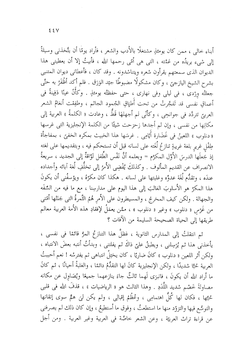 أبناء خالي ممن كان يومئذ مشتغلا بالأدب والشعر فأراد يوما أن يتخذني وسيلة إلي شئ يريده من عمته التي هي أمي رحمها الله فأبيت إلا أن يعطيني هذا الديوان الذي سمعتهم يقرأون شعره ويتناشدونه وقد كان فأعطاني ديوان المتنبي بشرح الشيخ اليازجي وكان مشكولا مضبوطا جيد الورق فلم أكد أظفر به حتي جعلته وردي في ليلي وفي نهاري حتي حفظته يومئذ وكأن عينا دفينة في أعماق نفسي قد تفجرت من تحت أطباق الجمود الجائم وطففت أنغام الشعر العربي تتردد في جوانجي وكأني لم أجهلها قط وعادت الكلمة العربية إلي مكانها من نفسي وإن لم أجدها زحزحت شيئا من الكلمة الإنجليزية التي غرسها دنلوب اللعين في غضارة أيامي غرسها هذا الخبيث بمكره الخفي بمفاجأة طفل غرير بلغة غريبة تنازع لغته على لسانه قبل أن تستحكم فيه وبتقديمها على لغته إذ جعلها الدرس الأول المكرم وبعلمه أن نفس الطفل تواقة إلي الجديد سريعة الانصراف عن القديم المألوف وكذلك يفضي الأمر إلي تخلف لغة أبائه وأجداده عنده وتقدم لغة عدوه وغلبتها على لسانه هكذا كان مكره ويؤسفني أن يكون هذا المكر هو الأسلوب الغالب إلي هذا اليوم على مدارسنا مع ما فيه من السفه والجهالة ولكن كيف المخرج والمسيطرون على الأمر هم الثمرة التي جنتها أمتي من غرس دنلوب وغير دنلوب ممن يعمل لإفقاد هذه الأمة العربية معالم طريقها إلي الحياة الصحيحة السليمة من الآفات؟