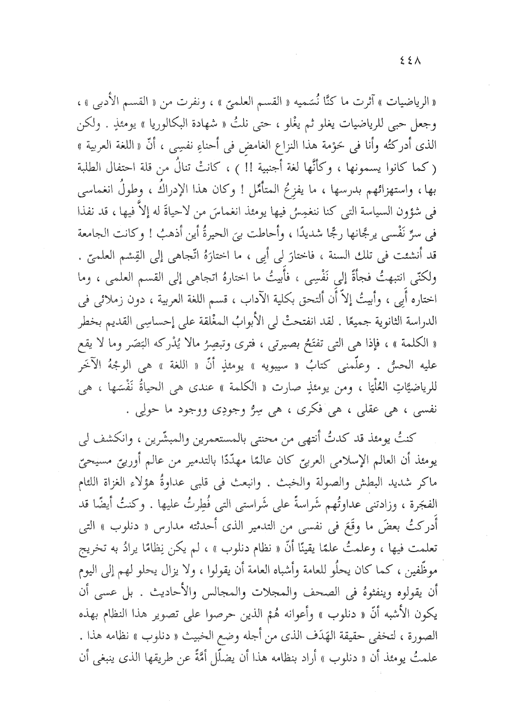 الرياضيات آثرت ما كنا نسميه القسم العلمي ونفرت من القسم الأدبي وجعل حبي للرياضيات يغلو ثم يغلو حتي نلت شهادة البكالوريا يومئذ ولكن الذي أدركته وأنا في حومة هذا النزاع الغامض في أحناء نفسي أن اللغة العربية كما كانوا يسمونها وكأنها لغة أجنبية كانت تنال من قلة احتفال الطلبة بها في واستهزائهم بدرسها ما يفزع المتأمل وكان هذا الإدراك وطول انغماسي في شؤون السياسة التي كنا ننغمس فيها يومئذ انغماس من لا حياة له إلا فيها قد نفذا في سر نفسي يرجانها رجا شديدا وأحاطت بي الحيرة أين أذهب وكانت الجامعة قد أنشئت في تلك السنة فاختار لي أبي ما اختاره اتجاهي إلي القسم العلمي ولكني انتبهت فجأة إلي نفسي فأبيت ما اختاره اتجاهي إلي القسم العلمي وما أختاره أبي وأبيت إلا أن ألتحق بكلية الآداب قسم اللغة العربية دون زملائي في الدراسة الثانوية جميعا لقد انفتحت لي الأبواب المغلقة على إحساسي القديم بخطر الكلمة فإذا هي التي تفتح بصيرتي فتري وتبصر مالا يدركه البصر وما لا يقع عليه الحس وعلمني كتاب سيبويه يومئذ أن اللغة هي الوجه الآخر للرياضيات العليا ومن يومئذ صارت الكلمة عندي هي الحياة نفسها هي نفسي هي عقلي هي فكري هي سر وجودي ووجود ما حولي.