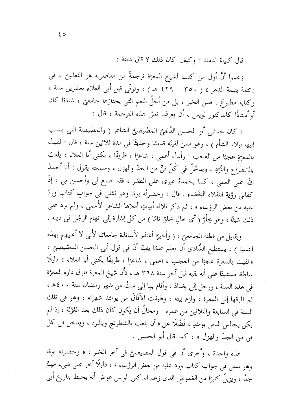 زعموا أن أول من كتب لشيخ المعرة ترجمة من معاصريه هو الثعالبي في تتمة يتيمة الدهر 350 - 429 هـ وتوفى قبل أبي العلاء بعشرين سنة وكتابه مطبوع فمن الخير بل من أجل النعم التي يحتازها جامعي شاديا كان أو أستاذا كالدكتور لويس أن يعرف نص هذه الترجمة قال: