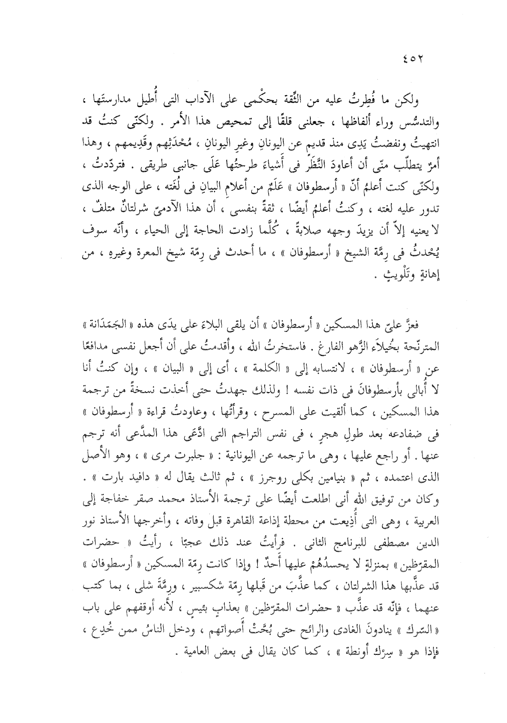 ولكن ما فطرت عليه من الثقة بحكمي على الآداب التي أطيل مدارستها والتدسس وراء ألفاظها جعلني قلقا إلي تمحيص هذا الأمر ولكني كنت قد انتهيت ونفضت يدي منذ قديم عن اليونان وغير اليونان محدثهم وقديمهم وهذا أمر يتطلب مني أن أعاود النظر في أشياء طرحتها على جانبي طريقي فترددت ولكني كنت أعلم أن أرسطوفان علم من أعلام البيان في لغته على الوجه الذي تدور عليه لغته وكنت أعلم أيضا ثقة بنفسي أن هذا الآدمي شرلتان متلف لا يعنيه إلا أن يزيد وجهه صلابة كلما زادت الحاجة إلي الحياء وأنه سوف يحدث في رمة الشيخ أرسطوفان ما أحدث في رمة شيخ المعرة وغيره من إهانة وتلويث.