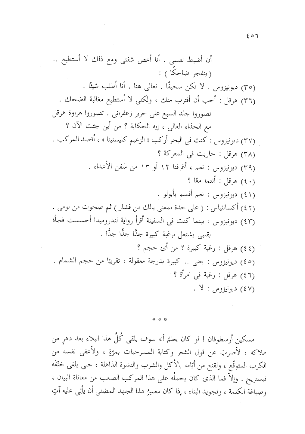 مسكين أرسطوفان! لو كان يعلم أنه سوف يلقي كل هذا البلاء بعد دهر من هلاكه لأضرب عن قول الشعر وكتابة المسرحيات بمرة ولأعفي نفسه من الكرب المتوقع ولقنع من أيامه بالأكل والشرب والنشوة الذاهلة حتي يلقي حتفه فيستريح وإلا فما الذي كان يحمله على هذا المركب الصعب من معاناة البيان وصياغة الكلمة وتجويد البناء إذا كان مصير هذا الجهد المضني أن يأتي عليه آتٍ