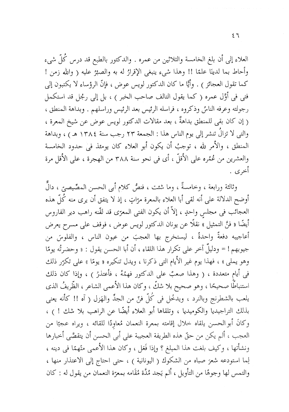 العلاء إلى أن بلغ الخانسة والثلاثين من عمره والدكتور بالطبع قد درس كل شيء وأحاط بما لدينا علما وهذا شيء ينبغي الإقرار له به والصبر عليه والله زمن كما تقول العجائز وأيا ما كان الدكتور لويس عوض فإن الرؤساء لا يكتبون إلى فتى في أول عمره كما يقول التالف صاحب الخبربل إلى رجل قد استكمل رجولته وعرفه الناس وذكروه فراسله الرئيس بعد الرئيس وراسلهم وبداهة المنطق إن كان بقى للمنطق بداهة بعد مقالات الدكتور لويس عوض عن شيخ المعرة والتي لا تزال تنشر إلى يوم الناس هذا الجمعة 23 رجب سنة 1384 هـ وبداهة المنطق والأمر لله توجب أن يكون أبو العلاء كان يومئذ في حدود الخامسة والعشرين من عمره على الأقل أي في نحو سنة 388 من الهجرة على الأقل مرة أخرى.