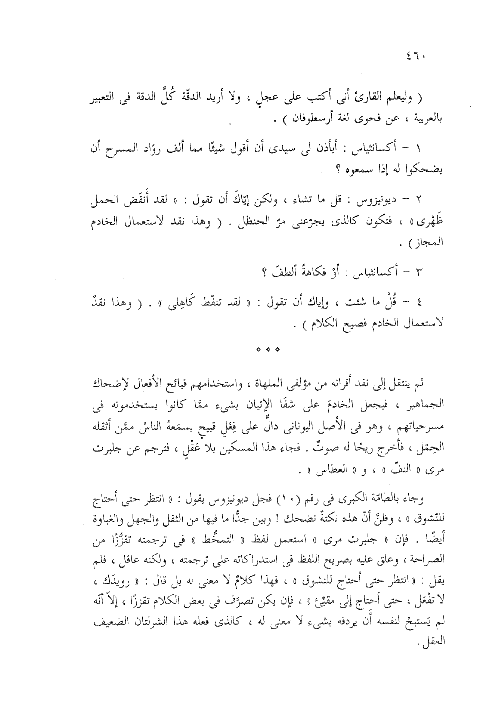 وجاء بالطامة الكبري في رقم (10) فجل ديونيزوس يقول: انتظر حتي أحتاج للنشوق وظن أن هذه نكتة تضحك وبين جدا ما فيها من الثقل والجهل والغباوة أيضا فإن جلبرت مري استعمل لفظ التمخط في ترجمته تقززا من الصراحة وعلق عليه بصريح اللفظ في استدراكاته على ترجمته ولكنه عاقل فلم يقل انتظر حتي أحتاج للنشوق فهذا كلام لا معني له بل قال رويدك لا تفعل حتي أحتاج إلي مقيئ فإن يكن تصرف في بعض الكلام تقززا إلا أنه لم يستبح لنفسه أن يردفه بشئ لا معني له كالذي فعله هذا الشرلتان الضعيف العقل.