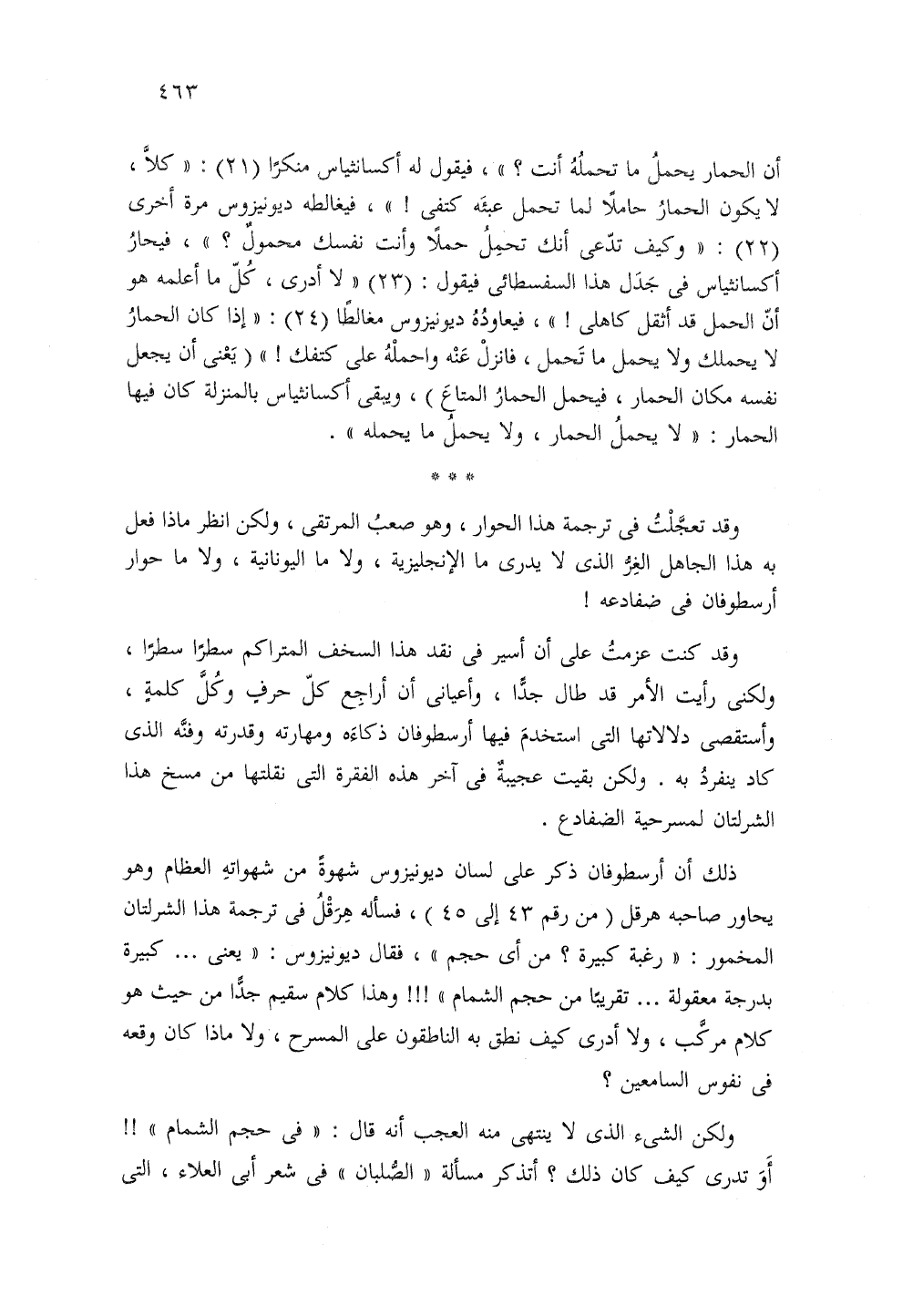 وقد تعجَّلْتُ في ترجمة هذا الحوار وهو صعب المرتقي ولكن انظر ماذا فعل به هذا الجاهل الغر الذي لا يدري ما الإنجليزية ولا ما اليونانية ولا ما حوار أرسطوفان في ضفادعه!