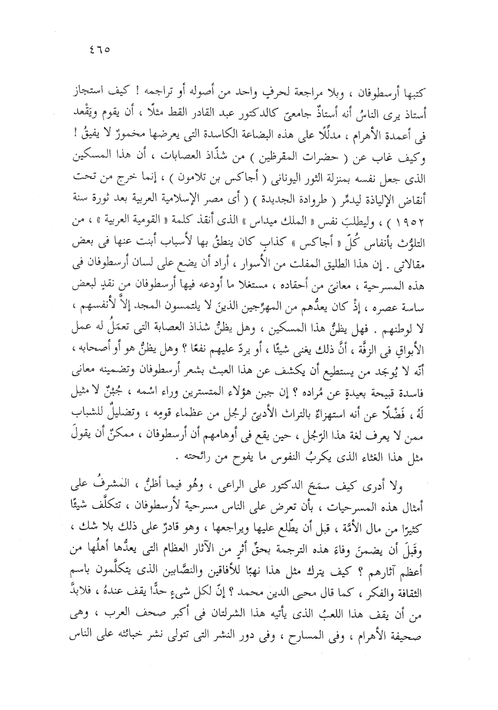 ولا أدري كيف سمح الدكتور عليّ الراعي وهو فيما أظن المشرف على أمثال هذه المسرحيات بأن تعرض على الناس مسرحية لأرسطوفان تتكلف شيئا كثيرا من مال الأمة قبل أن يطلع عليها ويراجعها وهو قادر على ذلك بلا شك وقبل أن يضمن وفاء هذه الترجمة بحق أثر من الآثار العظام التي يعدها أهلها من أعظم آثارهم كيف يترك مثل هذا نهبا للأفاقين والنصابين الذي يتكلمون باسم الثقافة والفكر كما قال محيي الدين محمد إن لكل شئ حدا يقف عنده فلابد من أن يقف هذا اللعب الذي يأتيه هذا الشرلتان في أكبر صحف العرب وهي صحيفة الأهرام وفي المسارح وفي دور النشر التي تتولي نشر خبائثه على الناس
