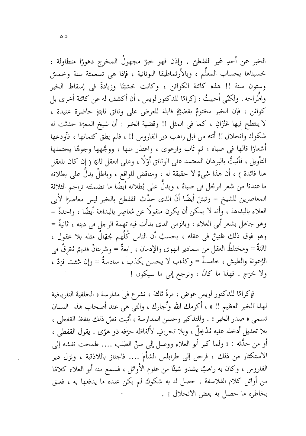 الخبر عن أحد غير القفطي. وإذن فهو خبر مجهول المخرج دهورا متطاولة حسبناها بحساب المعلم وبالأرثماطيقا اليونانية فإذا هي تسعمئة سنة وخمس وستون سنة هذه كائنة الكوائن وكانت حسبنا وزيادة في إسقاط الخبر وإطراحه ولكني أحببت إكراما للدكتور لويس أن أكشف له عن كائنة أخرى بل كوائن فإن الخبر مختوم بقضية قابلة للعرض على وثائق ثابتة حاضرة عتيدة لا ينتطح فيها عنزان كما في المثل وقضية الخبر أن شيخ المعرة حدثت له شكوك وإنحلال أتته من قبل راهب دير الفاروس فلم يطق كتمانها فأودعها أشعار قالها في صباه ثم تاب وارعوي واعتذر منها ووجهها وجوها يحتملها التأويل فأثبت البرهان المعتمد على الوثائق أولا وعلى العقل ثانيا إن كان للعقل هنا فائدة أن هذا شيء لا حقيقة له ومناقض للواقع وباطل يدل على بطلانه ما عندنا من شعر الرجل في صباه ويدل على بطلانه أيضا ما تضمنته تراجم الثلاثة المعاصرين للشيخ = وتبين أيضا أن الذي حدث القفطي بالخبر ليس معاصرا لأبي العلاء بالبداهة وأنه لا يمكن أن يكون منقولا عن معاصر بالبداهة أيضا واحدة = وهو جاهل بشسعر أبي العلاء وبالزمن الذي بدأت فيه تهمة الرجل في دينه ثانية = وهو فوق ذلك ظنين في عقله يحسب أن الناس كلهم جهال مثله بلا عقول ثالثة = ومختلط العقل من سمادير الهوى والإدمان رابعة = وشر لتان قديم معرق في الرعونة والطيش خامسة = وكذاب لا يحسن يكذب سادسة = وإن شئت فزد ولا حرج فهذا ما كان ونرجع إلى ما سيكون.