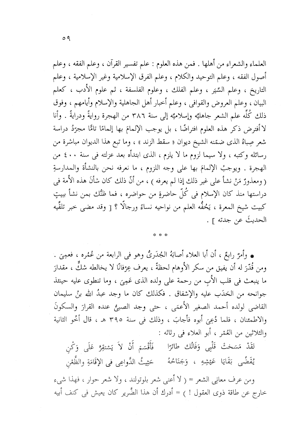 العلماء والشعراء من أهلها فمن هذه العلوم علم تفسير القرآن وعلم الفقه وعلم أصول الفقه وعلم التوحيد والكلام وعلم الفرق الإسلامية وغير الإسلامية وعلم التاريخ وعلم السير وعلم الفلك وعلوم الفلسفة ثم علوم الأدب كعلم البيان وعلم العروص والقوافيوعلم أخبار أهل الجاهلية والإسلام وأيامهم وفوق ذلك كله علم الشعر جاهلية وإسلامية إلى سنة 386 من الهجرة رواية ودراية وأنا لا أفترض ذكر هذه العلوم افتراضا بل يوجب الإلمام بها إلماما تاما مجرد دراسة شعر صباه الذي ضمنه الشيخ ديوان سقط الزيد وما تبع هذا الديوان مباشرة من رسائله وكتبع ولا سييما لزوم ما لا يلزم الذي ابتدأه بعد عزبته في سنة 400 من الهجرة ويوجب الإلمام بها على وجه اللزوم ما نعرف نحن النشأة والمدارسة ومعذور من نشأ على غير ذلك إذا لم يعرفه من أن ذلك كان شأن هذه الأمة في دراستها منذ كان الإسلامفى كل حاضرة من حواضره فما ظنك بمن نشأ ببيت كبيت شيخ المعرة يحفه العلم من نواحيه نساء ورجالا وقد مضى خبر تلقيه الحديث عن جدته.