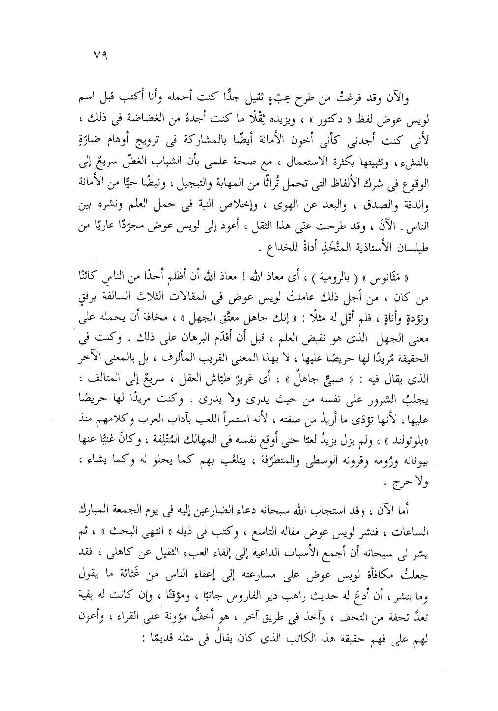 أما الآن وقد استجاب الله سبحانه دعاء الضارعين إليه في يوم الجمعة المبارك الساعات فنشر لويس عوض مقاله التاسع وكتب في ذيله انتهى البحث ثم يسر لي سبحانه أن أجمع الأسباب الداعية إلى إلقاء العبء الثقيل عن كاهلي فقد جعلت مكافأة لويس عوض على مسارعته إلى إعفاء الناس من غثاثة ما يقول وما ينشر أن أدع له حديث راهب دير الفاروس جانبا ومؤقتا وإن كانت له بقية تعد تحفة من التحف وآخذ في طريق آخر هو أخف مؤونة على القراء وأعون لهم على فهم حقيقة هذا الكاتب الذي كان يقال في مثله قديمًا: