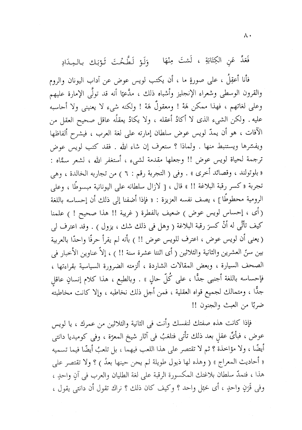 فأنا أعقل على صورة ما أن يكتب لويس عوض عن آداب اليونان والروم والقرون الوسطى وشعراء الإنجليز وأشباه ذلك مديعا أنه فد تولى الإمارة عليهم وعلى لغاتهم فهذا ممكن هه ومعقول هه ولكنه شيء لا يعنيني ولا أحاسبه عليه ولكن الشيء الذي لا أكاد أعقله ولا أحاسبه عليه ولكن الشيء الذي لا أكاد أعقله ولا يكاد يعقله عاقل صحيح العقل من الآفات هو أن يمد لويس عوض سلطان إمارته على لغة العرب فيشرح ألفاظها ويفسرها ويسبتنط منها ولماذا ستعرف إن شاء الله فقد كتب لويس عوض ترجمة لحياة لويس عوض وجعلها مقدمة لشيء أستغفر الله لشعر سماه "بلوتولند" وقصائد أخرى وفي التجربة رقم 6 من تجاربه الخالدة وهي تجربة كسر رقبة البلاغة قال لازال سلطانه على اليونانية مبسوطا وعلى الرومية محطوطا يصف نفسه العزيزة فإذا أضفنا إلى ذلك أن إحساسه باللغة أي إحساس لويس عوض ضعيف بالفطرة غريبة هذا صحيح علمنا كيف تأتي له أن كسر رقبة البلاغة وهل في ذلك شك يزول وقد اعترف لي يعني أو لويس عوض اعترف للويس عوض بأنه لم يقرأ حرفا واحدا بالعربية بيت سن العشرين والثانية والثلاثين أي اثنتا عشرة سنة إلا عناوين الأخبار في الصحف السيارة وبعض المقالات الشاردة ألزمنه الضرورة السياسية بقراءتها فإخساسه باللغة أجنبي جدا على كل حال وبالطبع هذا كلام إنسان عاقل جدا ومتمالك لجميع قواه العقلية فمن أجل ذلك نخاطبه وإلا كانت مخاطبته ضربا من العبث والجنون!!