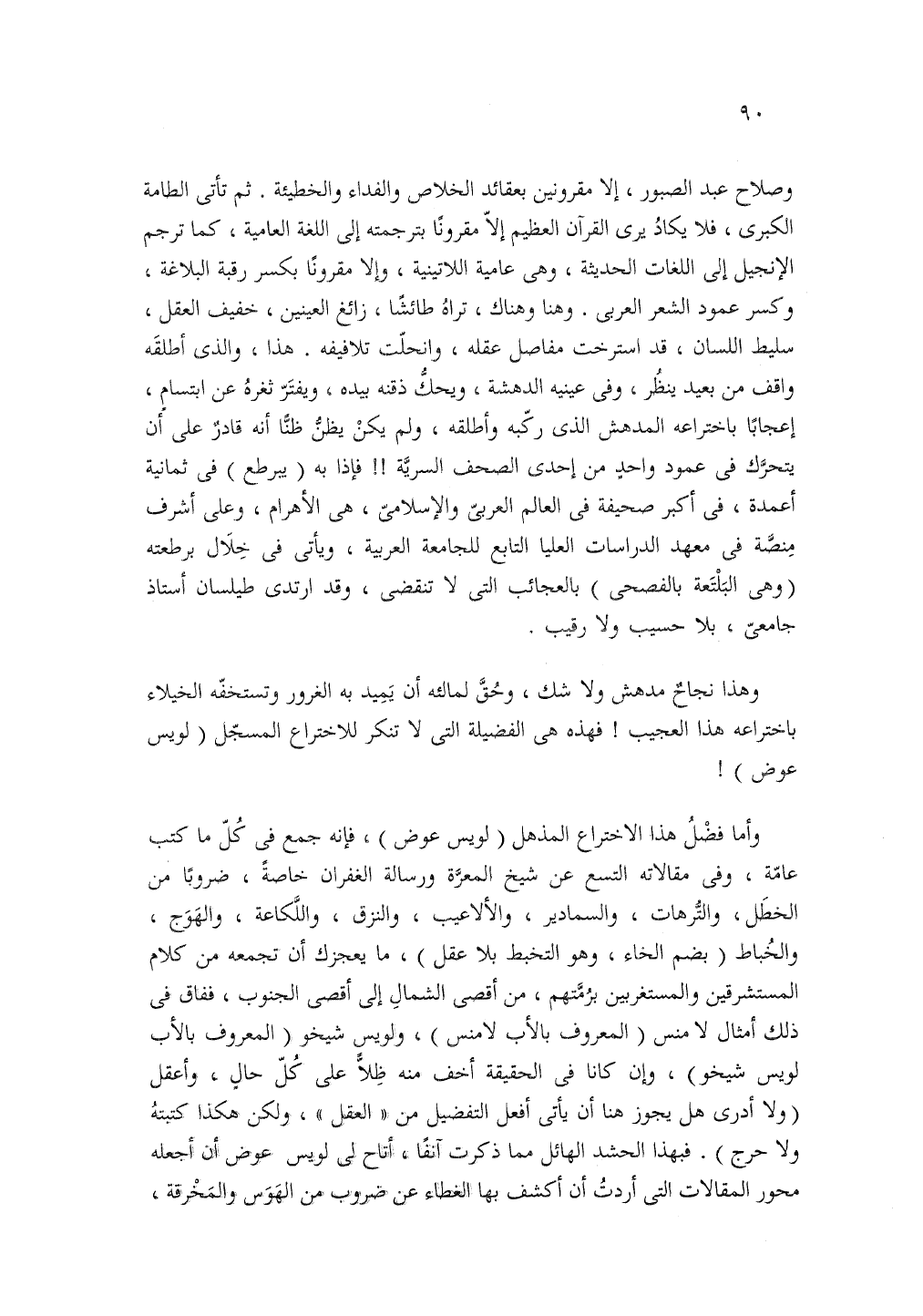 وأما فضل هذا الاختراع المذهل لويس عوض فإنه جمع في كل ما كتب عامة وفي مقالاته التسع عن شيخ المعرة ورسالة الغفران خاصة ضروبا من الخطل والترهات والسمادير والألاعيب والنزق واللكاعة والهوج والخباط (بضم الخاء وهو التخبط بلا عقل ما يعجزك أن تجمعه من كلام المستشرقين والمستغربين برمتهم من أقصى الشمال إلى أقصى الجنوب ففاق في ذلك أمثال لا منس المعروف بالأب لا منس ولويس شيخو المعروف بالأب لويس شيخو وإن كانا في الحقيقة أخف منه ظلا على كل حال وأعقل ولا أدري هل يجوز هنا أن يأتي أفعل التفضيل من العقل ولكن هكذا كتبته ولا حرج فبهذا الحشد الهائل مماذ ذكرت آنفا أتاح لي لويس عوض أن أجعله محور المقالات التي أردت أن أكشف بها الغطاء عن ضروب من الهوس والمخرقة