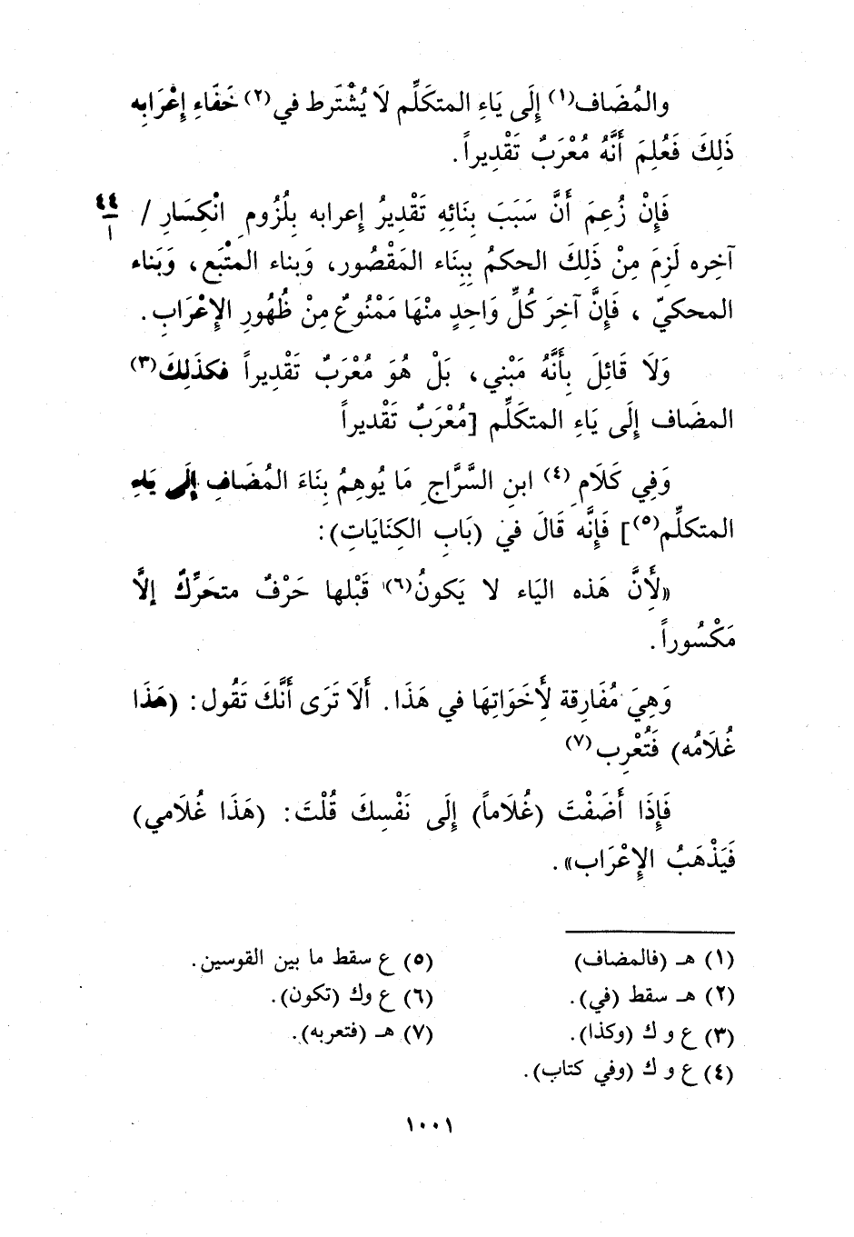 ولا قائل بأنه مبني، بل هو معرب تقديرا فكذلك3 المضاف إلى ياء المتكلم [معرب تقديرا وفي كلام4 ابن السراج ما يوهم بناء المضاف إلى ياء المتكلم] 5 فإنه قال في "باب الكنايات":