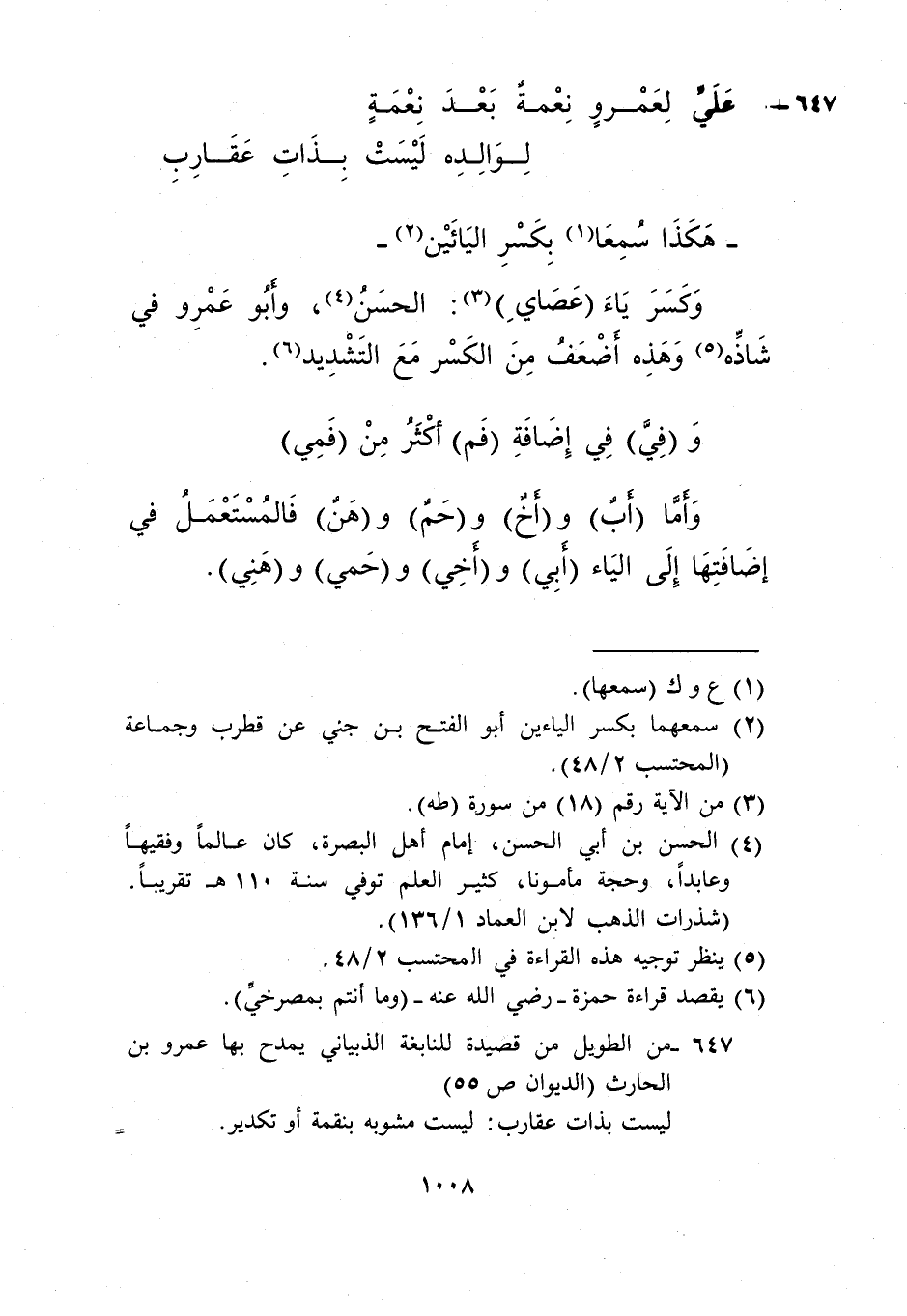 وكسر ياء "عصاي"3: الحسن4، وأبو عمرو في شاذه5 وهذه أضعف من الكسر مع التشديد6.