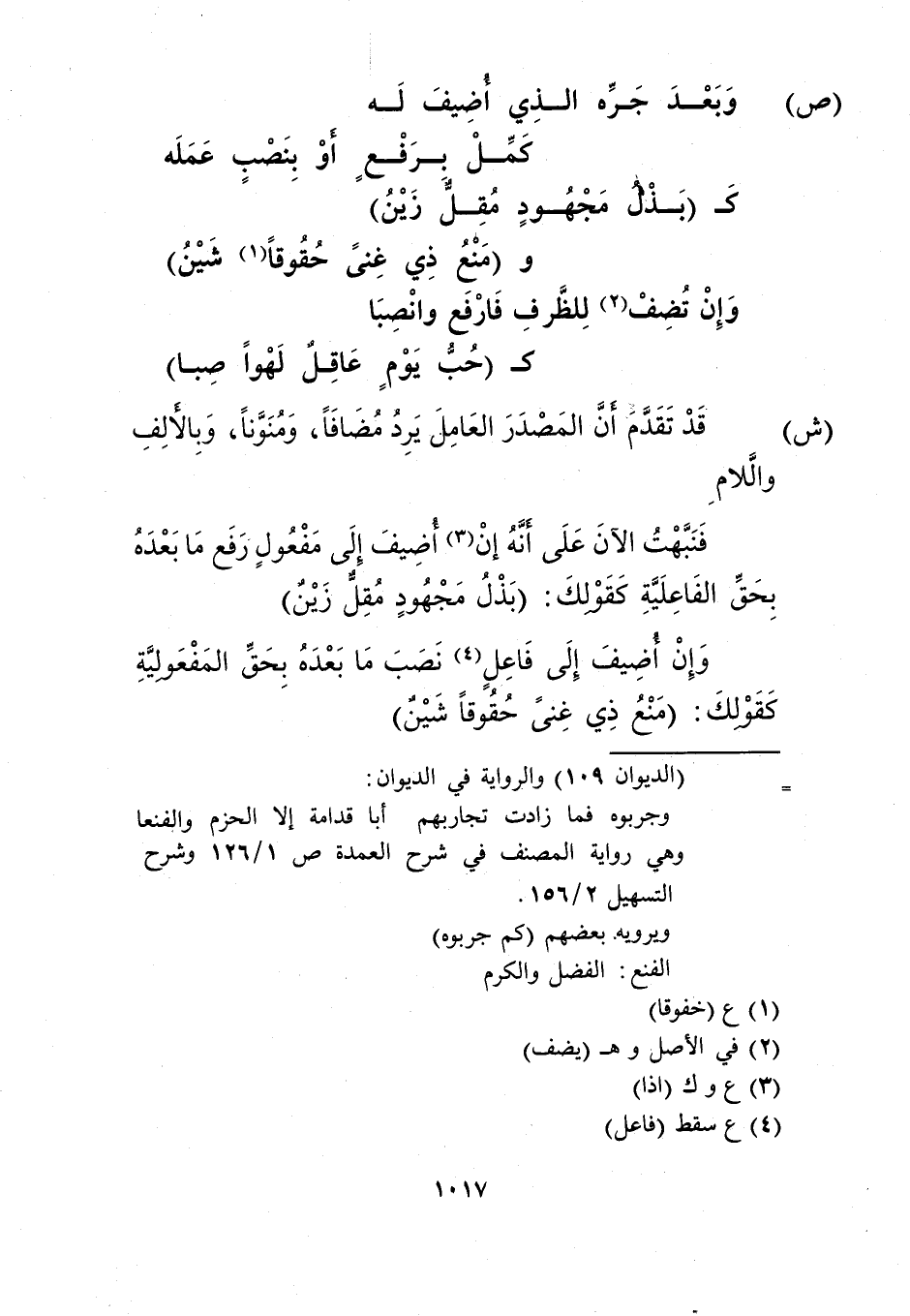 وإن أضيف إلى فاعل4 نصب ما بعده بحق المفعولية كقولك: "منع ذي غنى حقوقا شين".