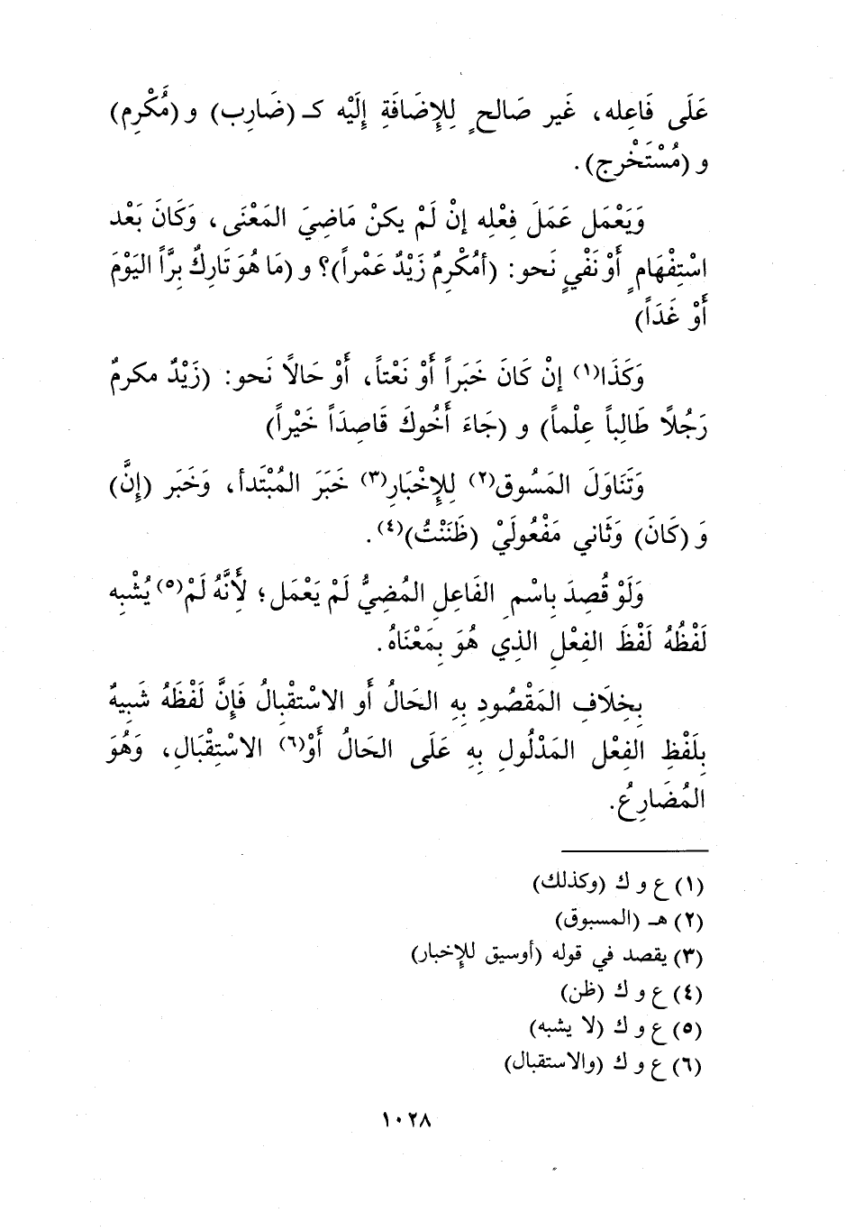 ويعمل عمل فعله إن لم يكن ماضي المعنى، وكان بعداستفهام أو نفي نحو: "أمكرم زيد عمرا" و"ما هو تارك برا اليوم أو غدا".