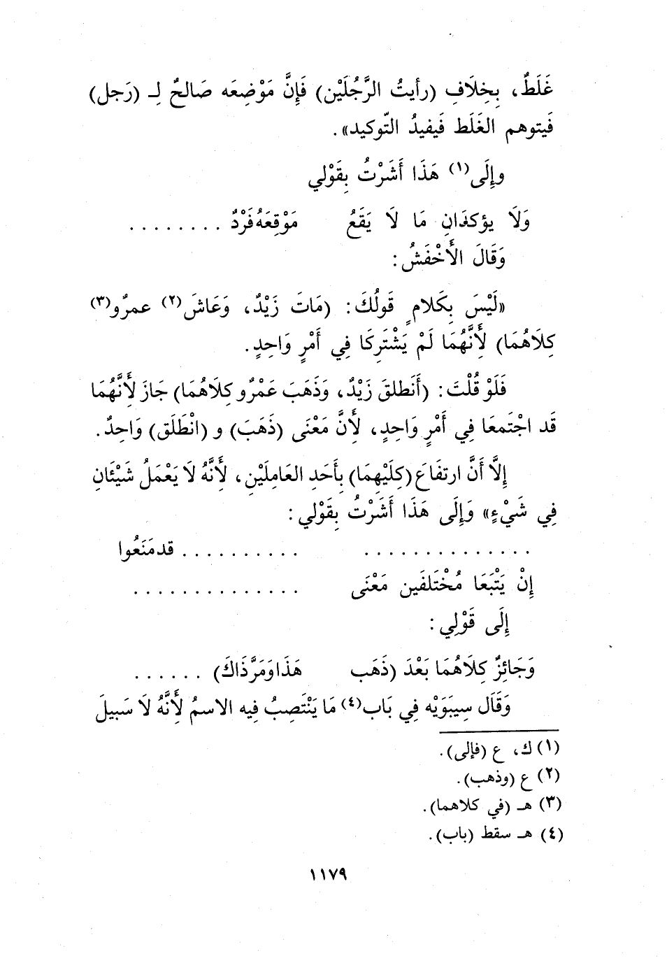"ليس بكلام قولك: "مات زيد، وعاش2 عمرو3 كلاهما"؛ لأنهما لم يشتركها في أمر واحد.