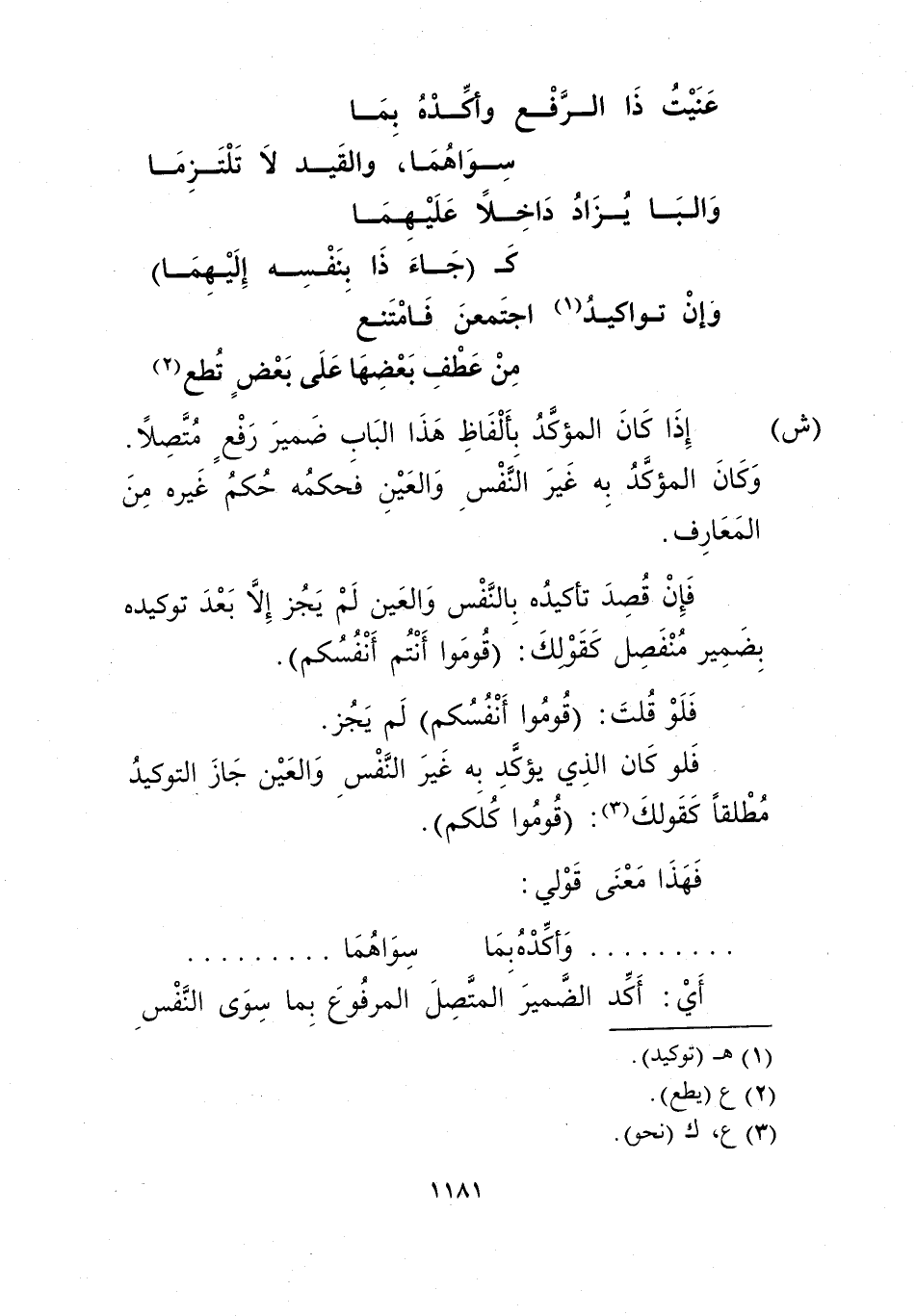 "ش" إذا كان المؤكد بألفاظ هذا الباب ضمير رفع متصلا. وكان المؤكد به غير النفس والعين فحكمه حكم غيره من المعارف.