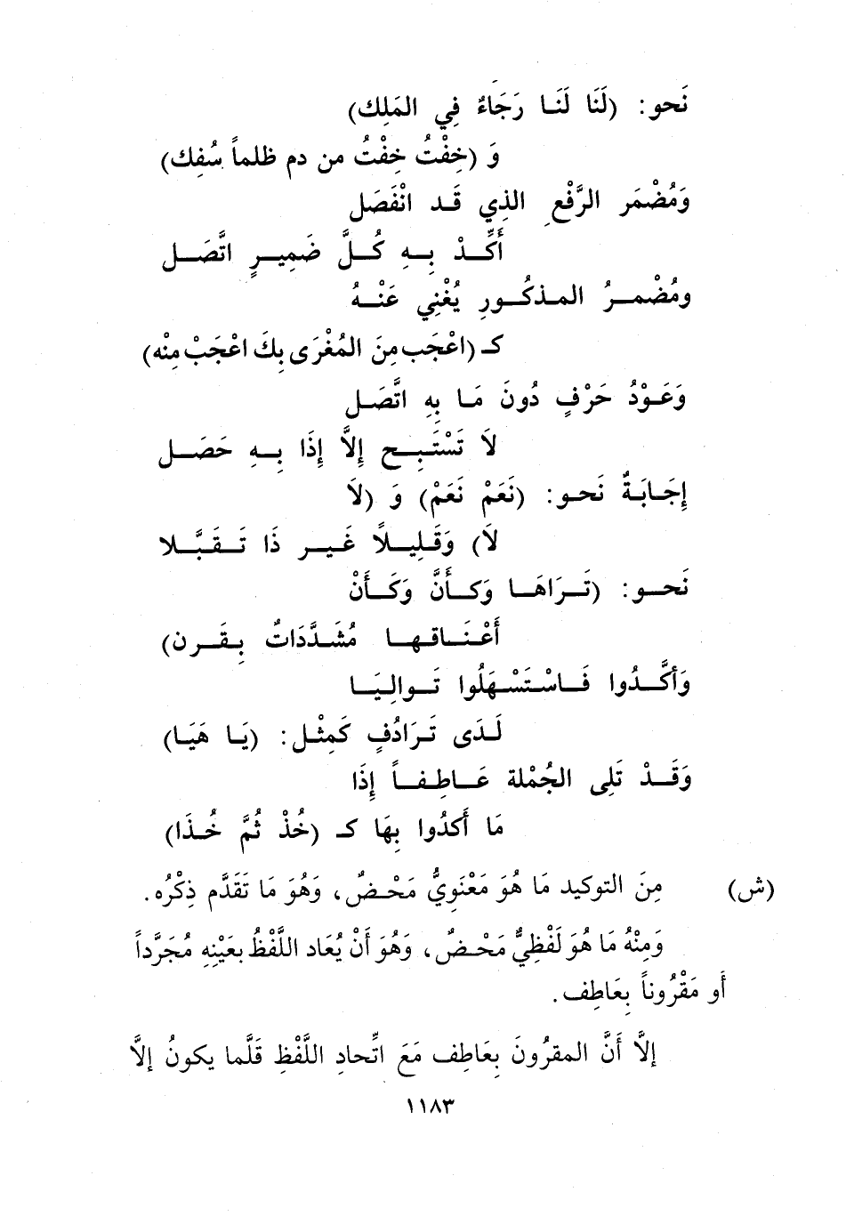 "ش" من التوكيد ما هو معنوي محض، وهو ما تقدم ذكره. ومنه ما هو لفظي محض، وهوأن يعاد اللفظ بعينه مجردا أو مقرونا بعاطف.